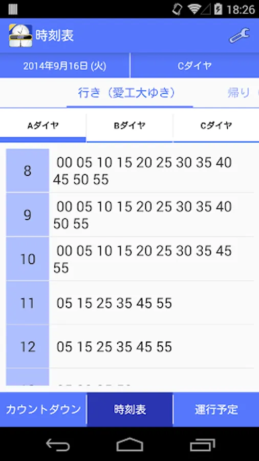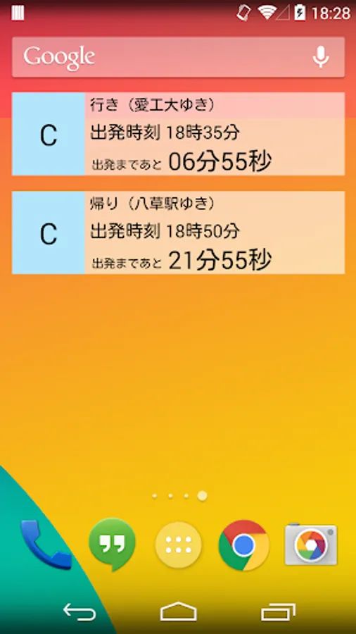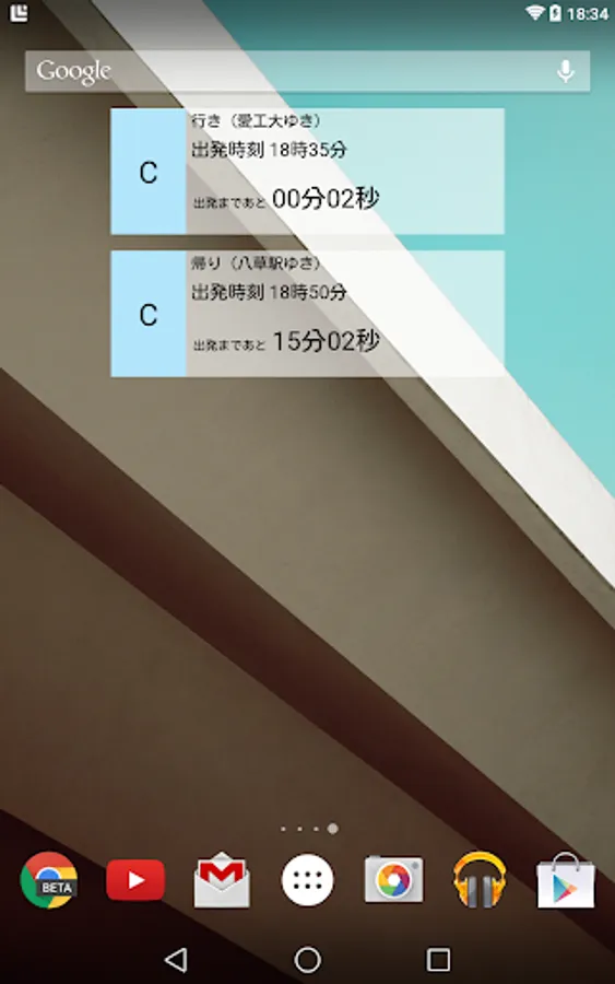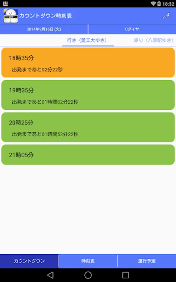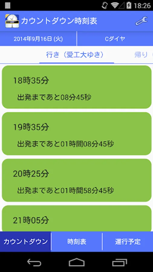 行き先はタブで変更できますが、「帰りの時間」(デフォルトでは14時30分)になると、自動的に帰りのカウントダウン時刻表が表示されます。