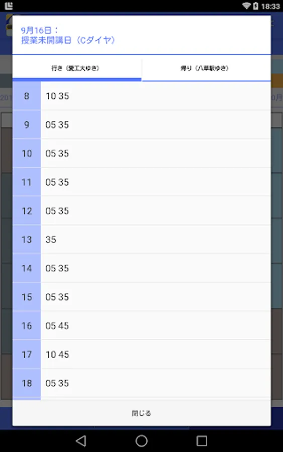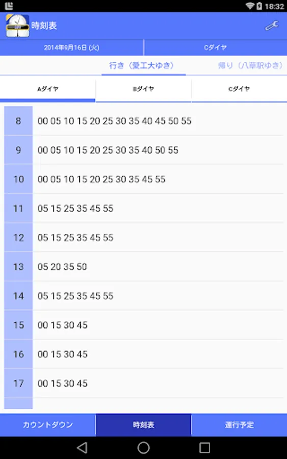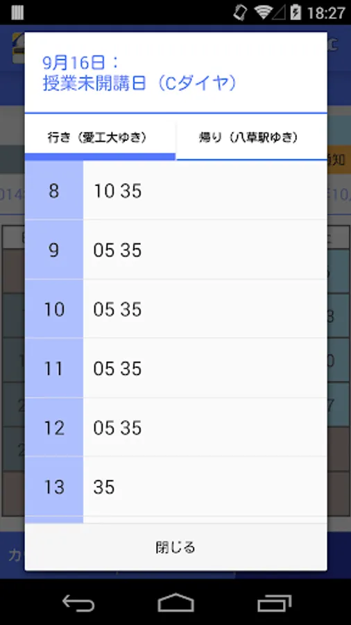 日付の下に表示されたダイヤをタップすると、その時刻表が表示されます。