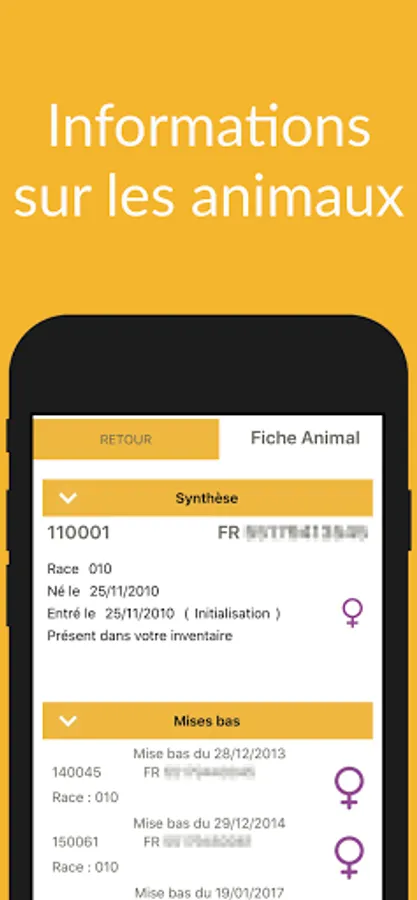 - Find quickly and simply all the information of an animal: genealogy, the latest reproduction information (births and struggles), performance control data (milk and meat), health treatments ...