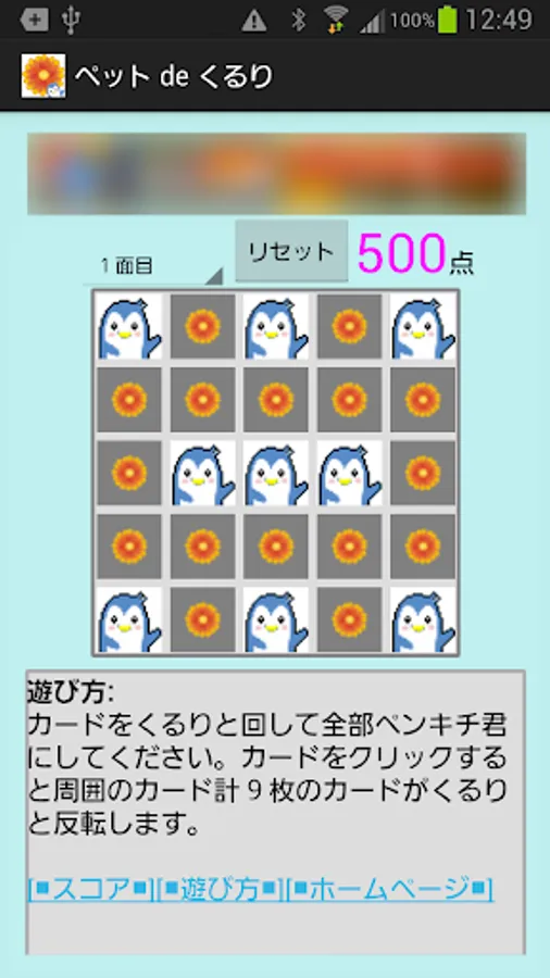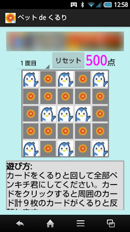「ペット de くるり」 は絵あわせパズルゲームです。カードをくるりと回して絵柄をそろえてください。カードをクリックするとクリックしたカードと周囲のカード計9枚のカードがくるりと反転します。