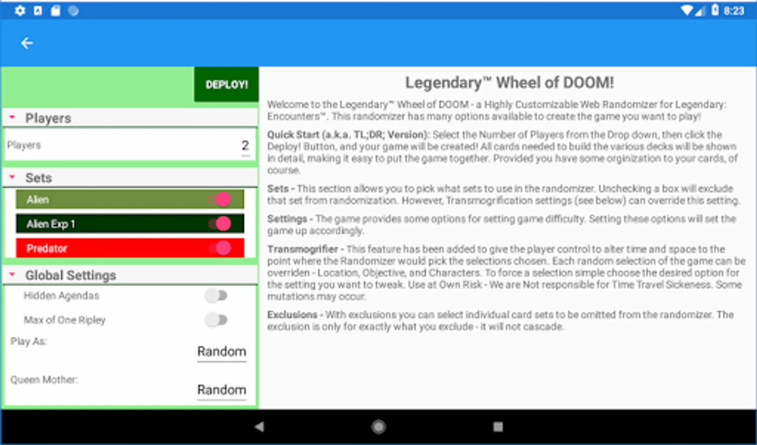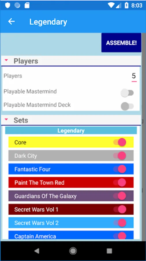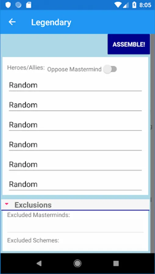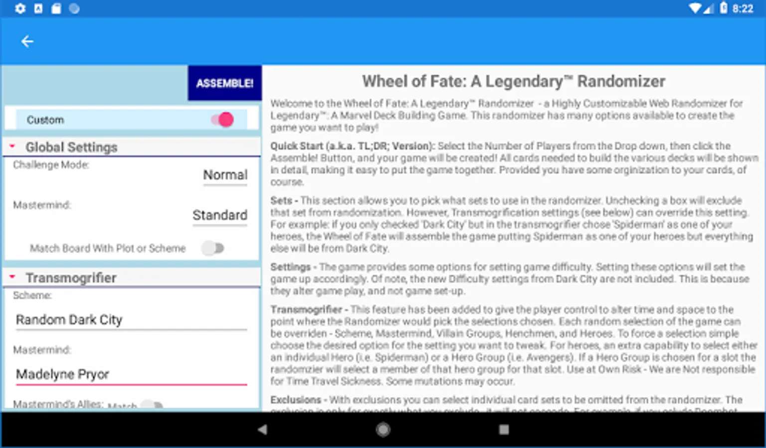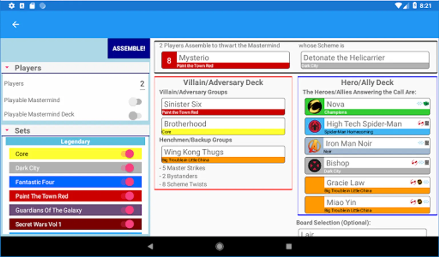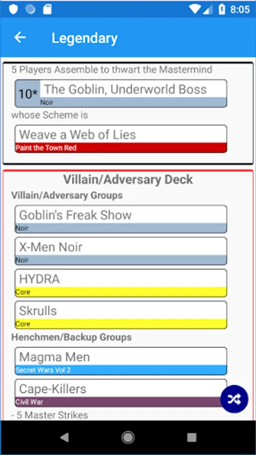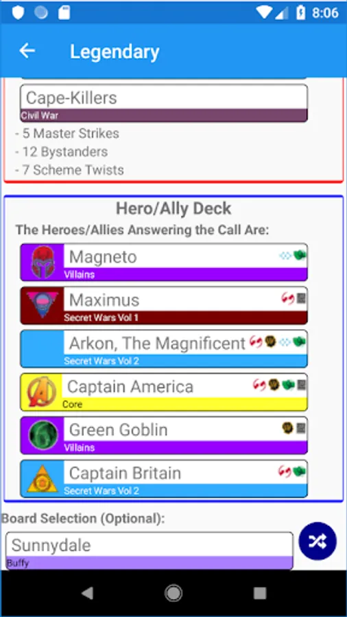 A Randomizer for Legendary and Legendary: Encounters. Includes all the sets, and also allows crossover between Legendary and Encounters. Many options to choose from - which sets to use, pick specific card sets or by category, also excludes ones you don't want.
