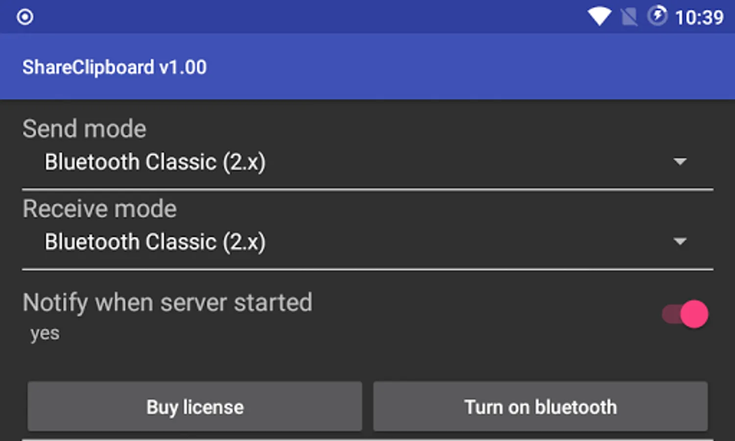 On the destination device, choose "Bluetooth Classic" from the "Receive mode" field, then turn Bluetooth on.