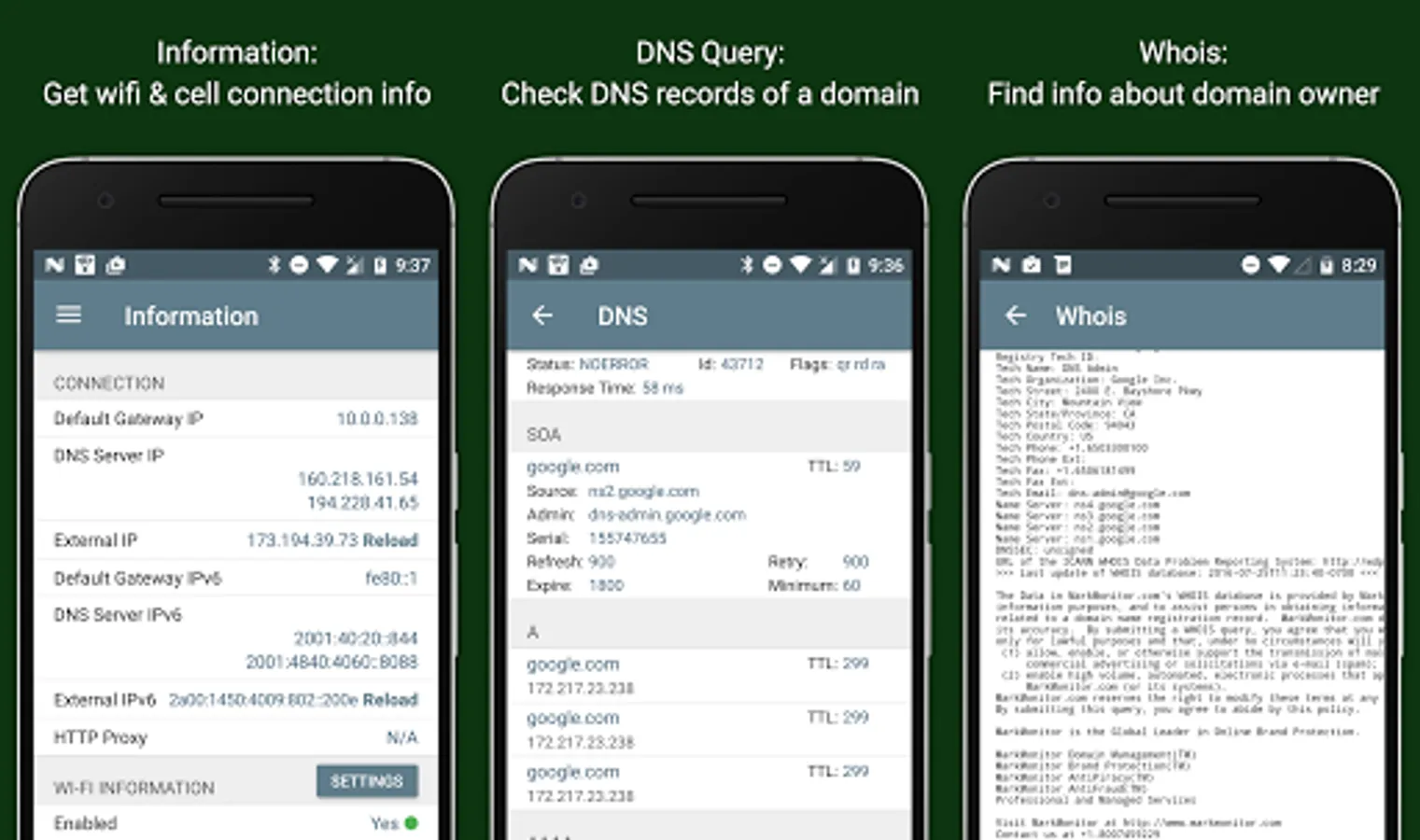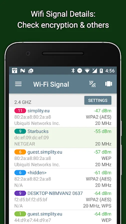 It is equipped with a fast wifi device discovery tool, including all the LAN device's addresses, manufacturers and names. Further, Network Analyzer contains standard net diagnostic tools such as ping, traceroute, port scanner, DNS lookup, and whois. Finally, it shows all neighbouring wi-fi networks together with additional details such as signal strength, encryption and router manufacturer to help discovering the best channel for a wireless router. Everything works with both IPv4 and IPv6.