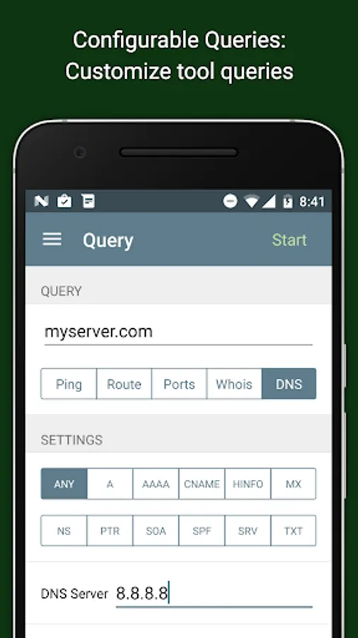 - Support for A, AAAA, SOA, PTR, MX, CNAME, NS, TXT, SPF, SRV records