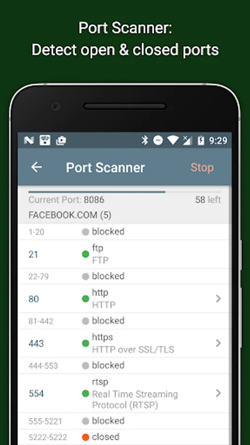 - Fast, adaptive algorithm for scanning the most common ports or user specified port ranges