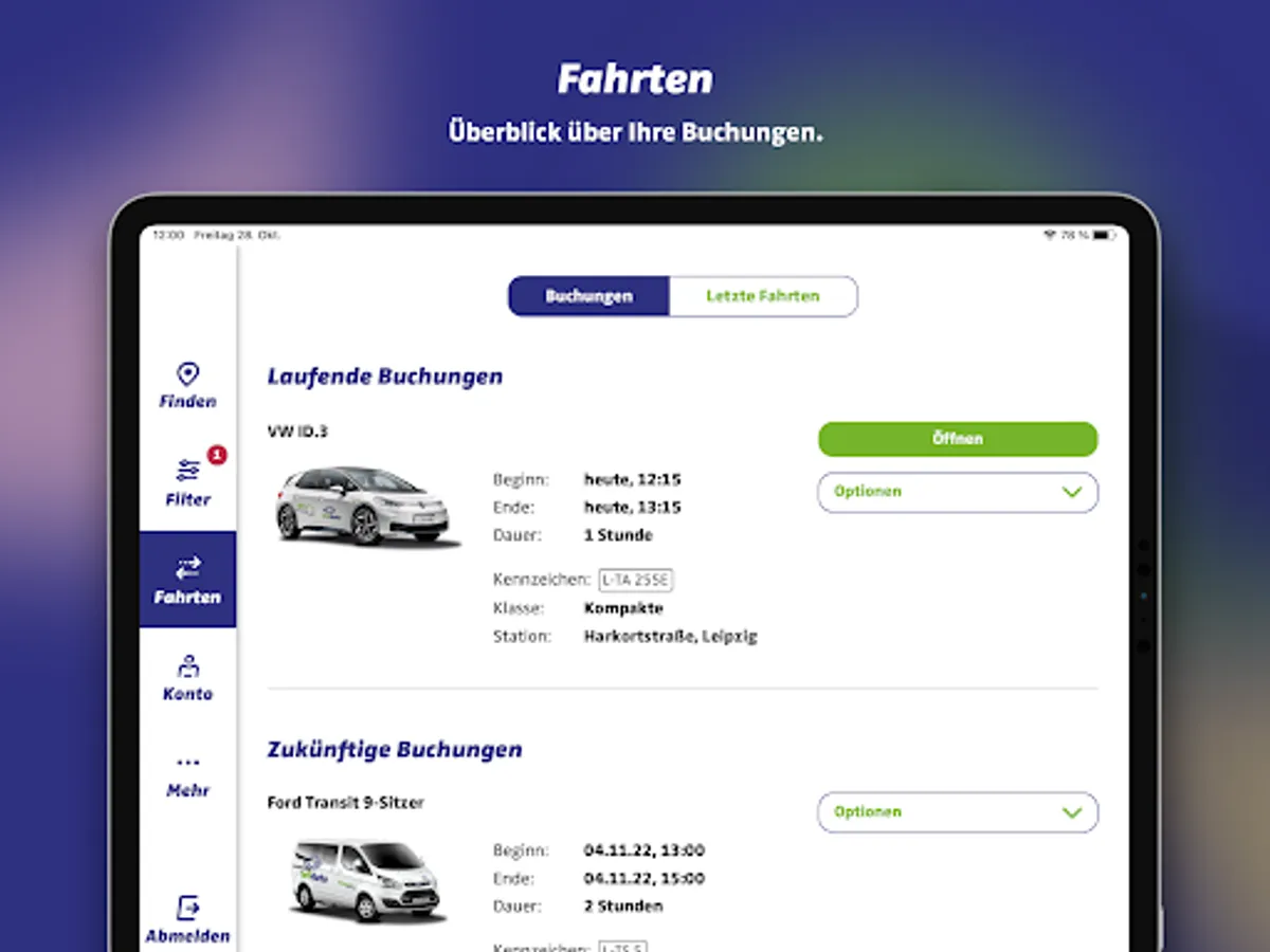 The app lists current and future bookings. You can call up information about the vehicle and station, change booking data or report problems quickly and easily. There is also an overview of your past trips and their costs.