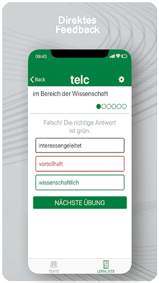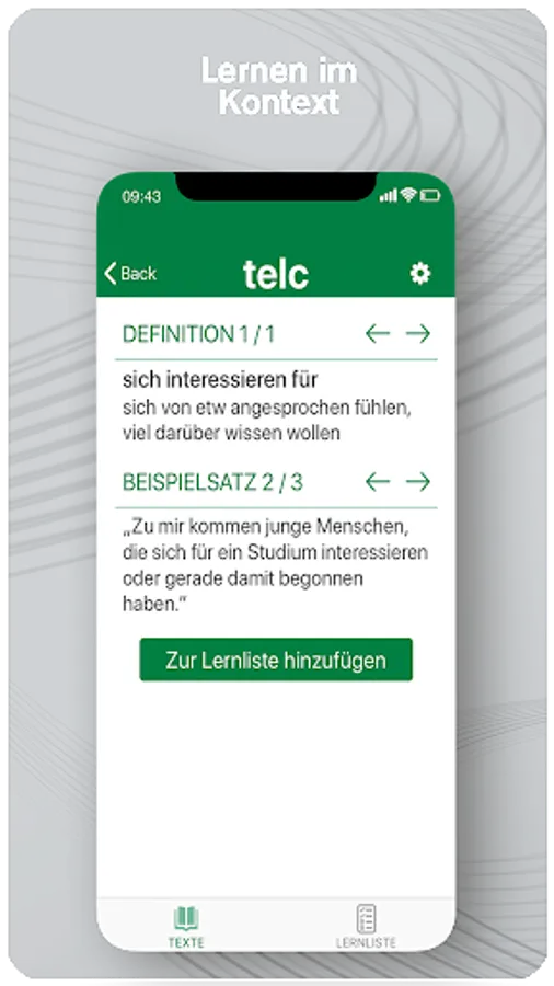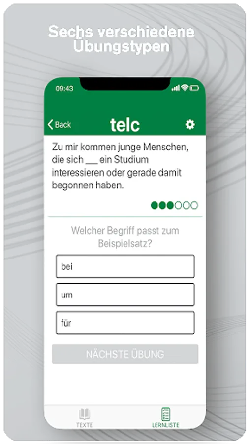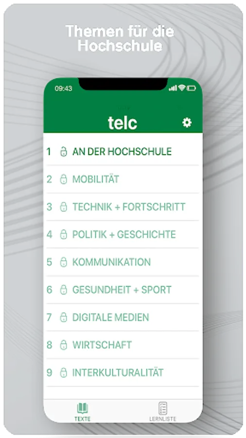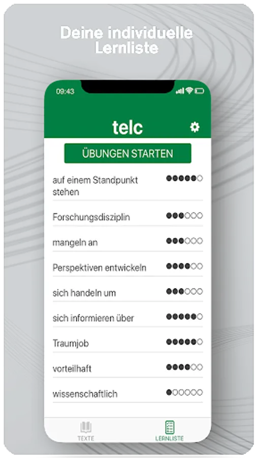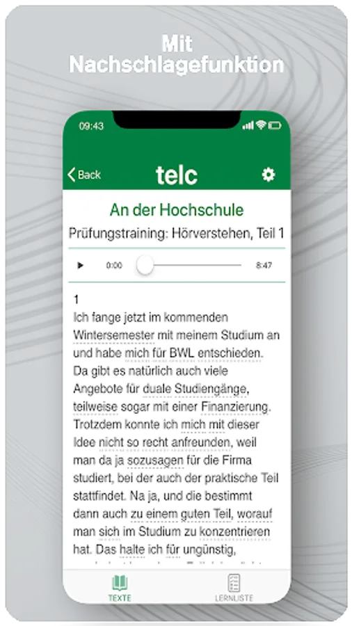 The app contains all reading and listening texts from the telc textbook Easy to study! German for university entrance C1 and thus offers additional practice opportunities for the textbook. You can of course also use them independently of the textbook for vocabulary training at C1 level.