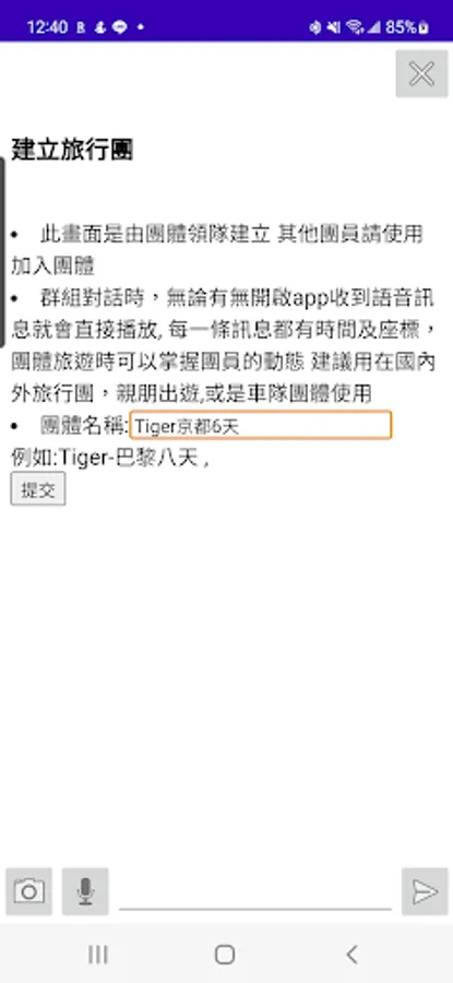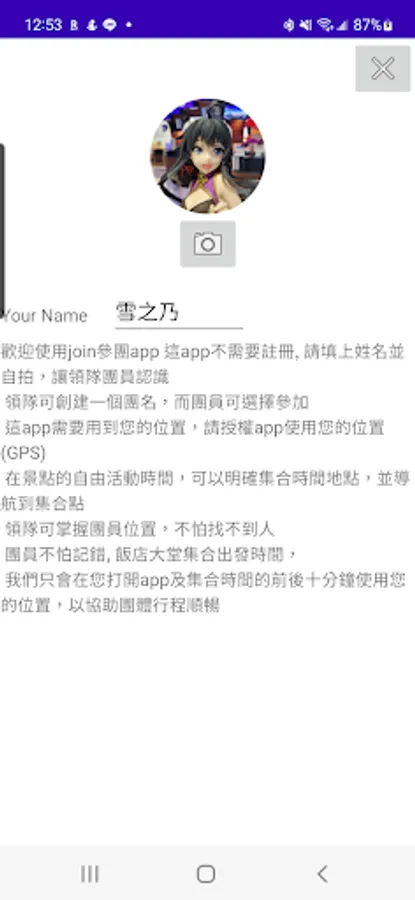 The app can be used without registration. Members only need to fill in their names and take a selfie, which is convenient for the leader to identify when they lead the group. After finishing the itinerary and choosing to leave the group, no communication information will be left. The communication function of this app is only available during the itinerary. used in