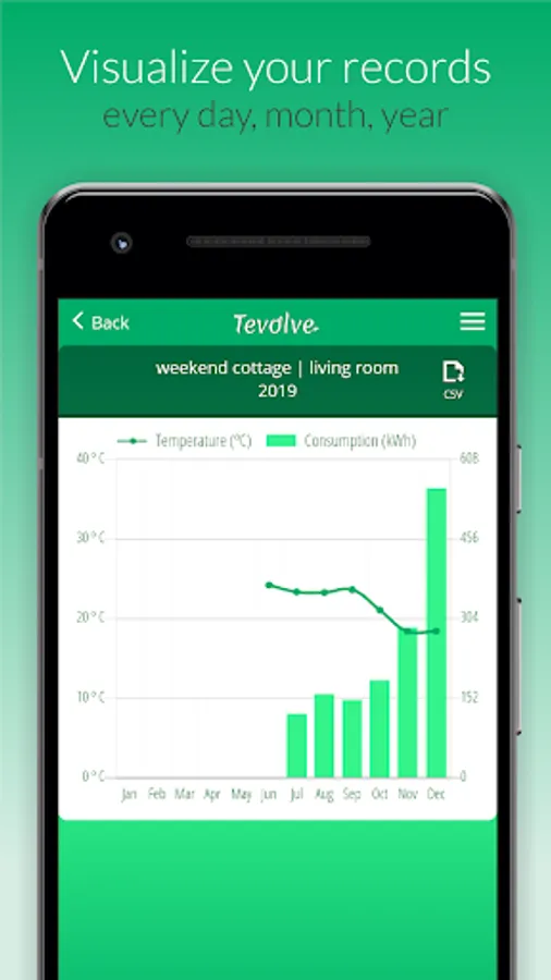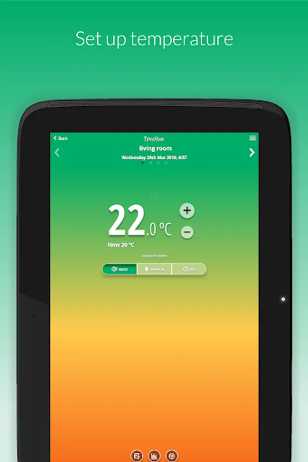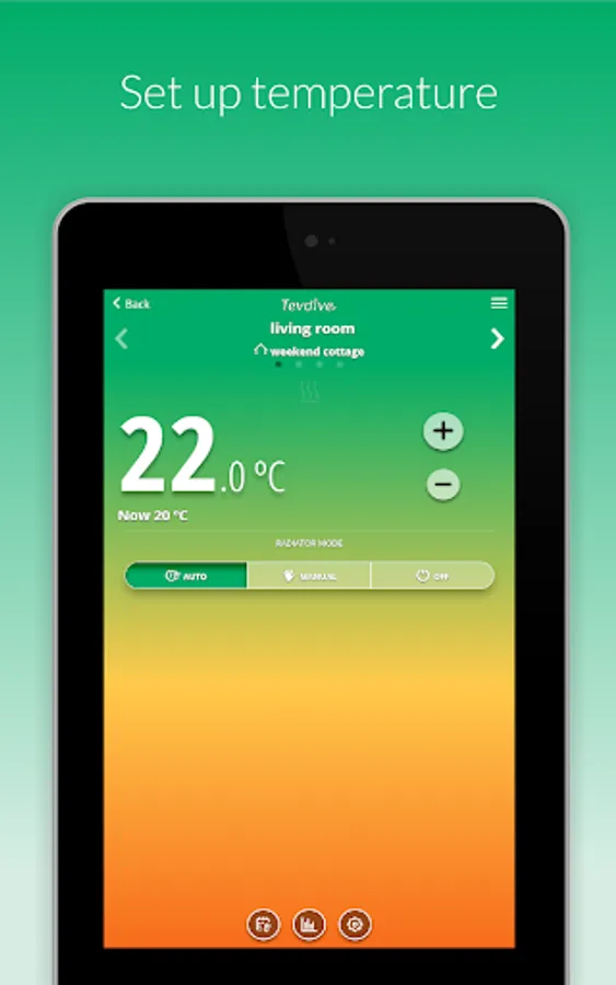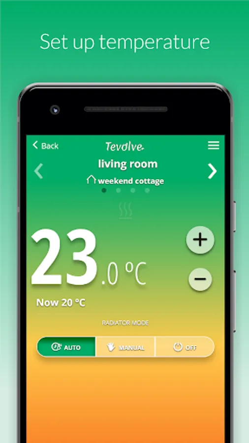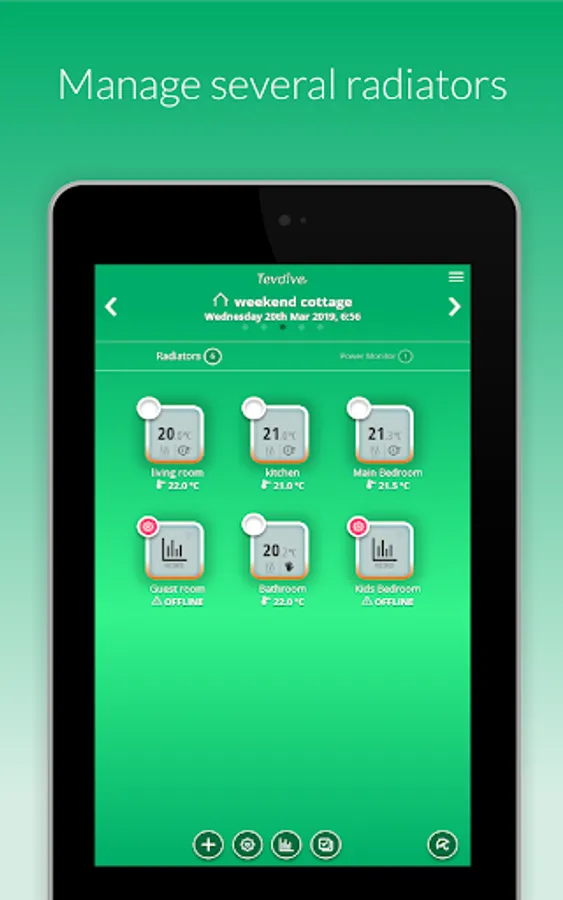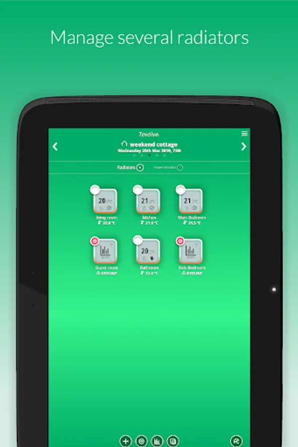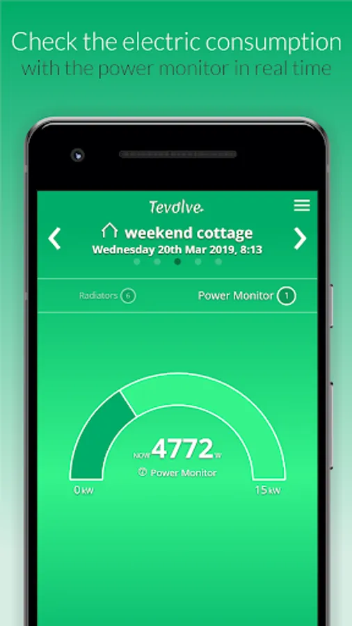 "Tevolve" application allows you to control your heating system from any place and at any time via Internet connection. You can turn on, turn off or modify your devices (radiators, power monitor) in all your homes from the same account.