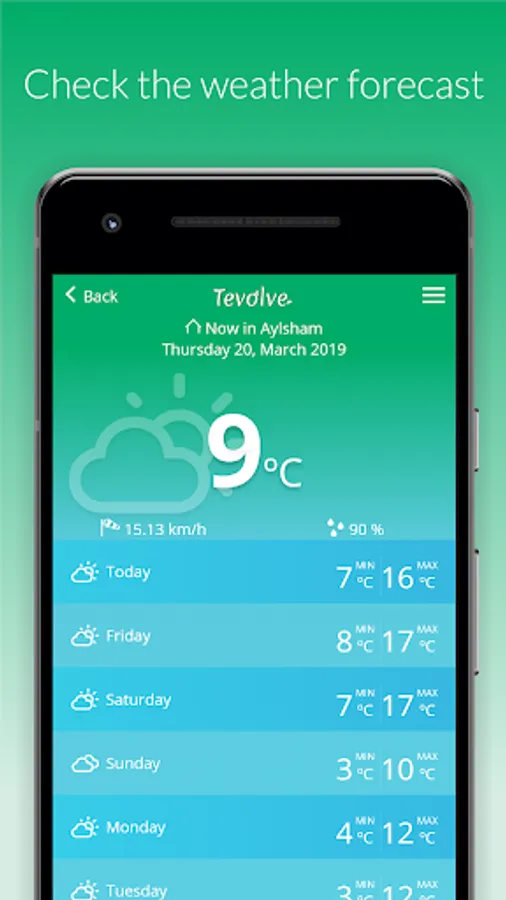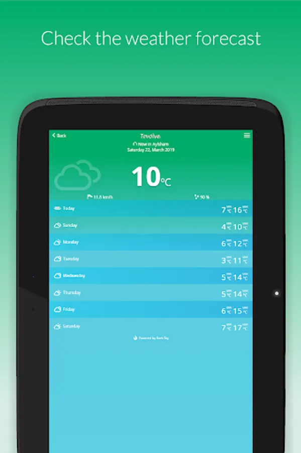 • WEATHER FORECAST: 7 days, maximum and minimum temperatures, wind speed and relative humidity.