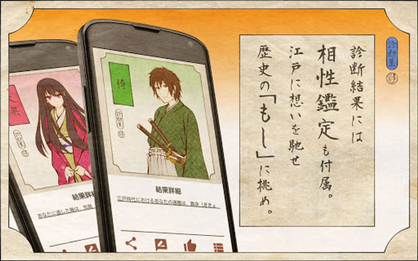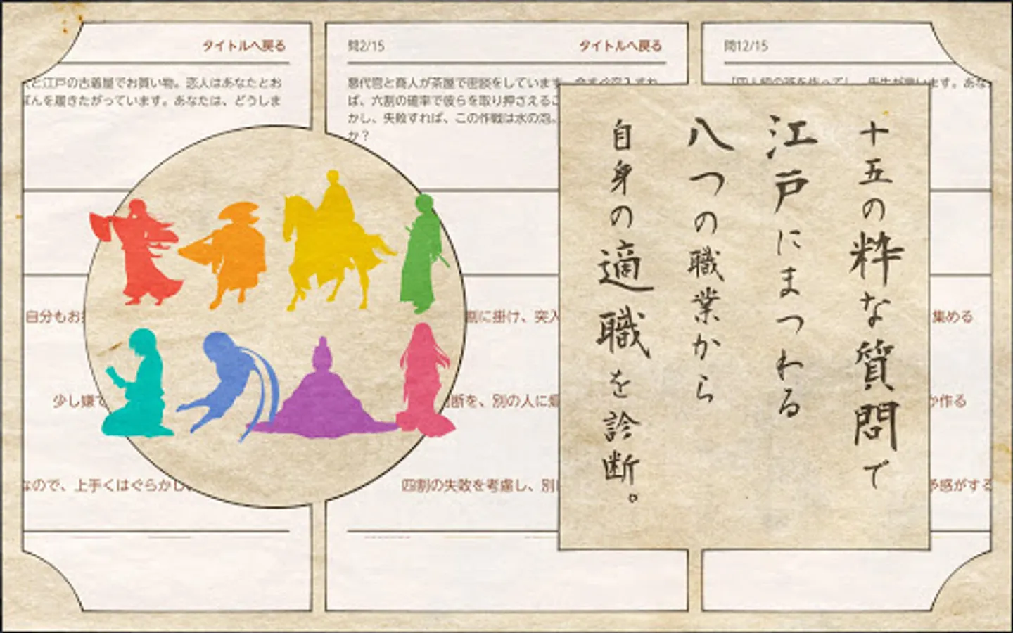 This diagnosis calculates your suitable job in the Edo period by a simple psychological test of 15 questions. It also has a compatibility diagnostic feature, listing jobs that will help you in that era. Perhaps that person will help you in modern society as well. Why don't you ask your friends to do it and find a good companion?