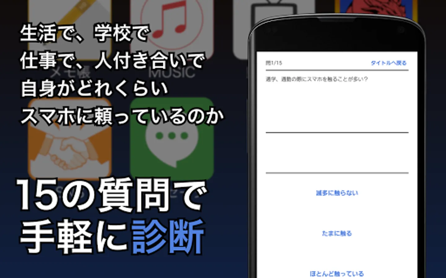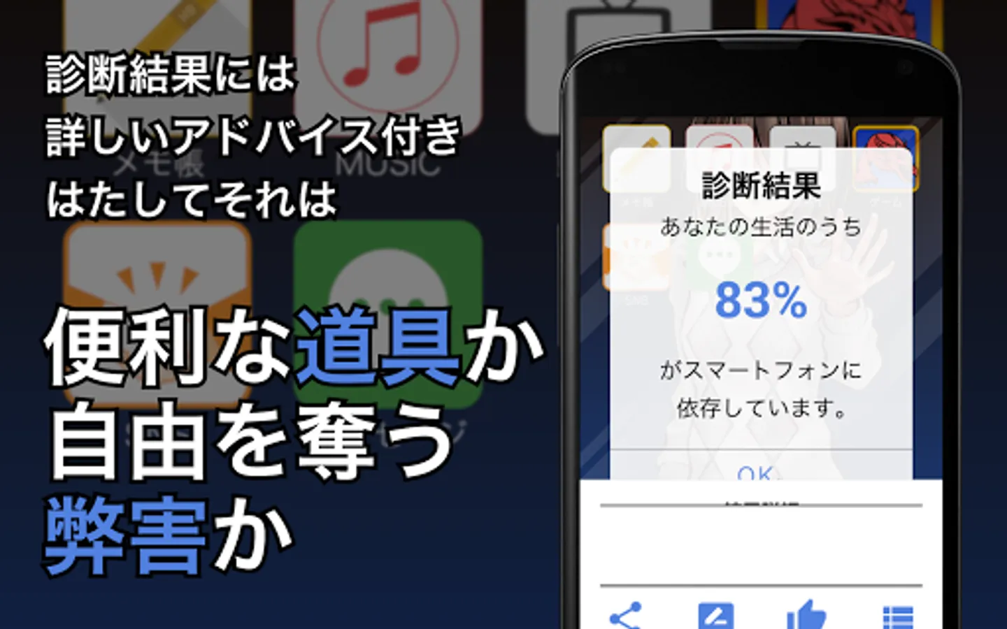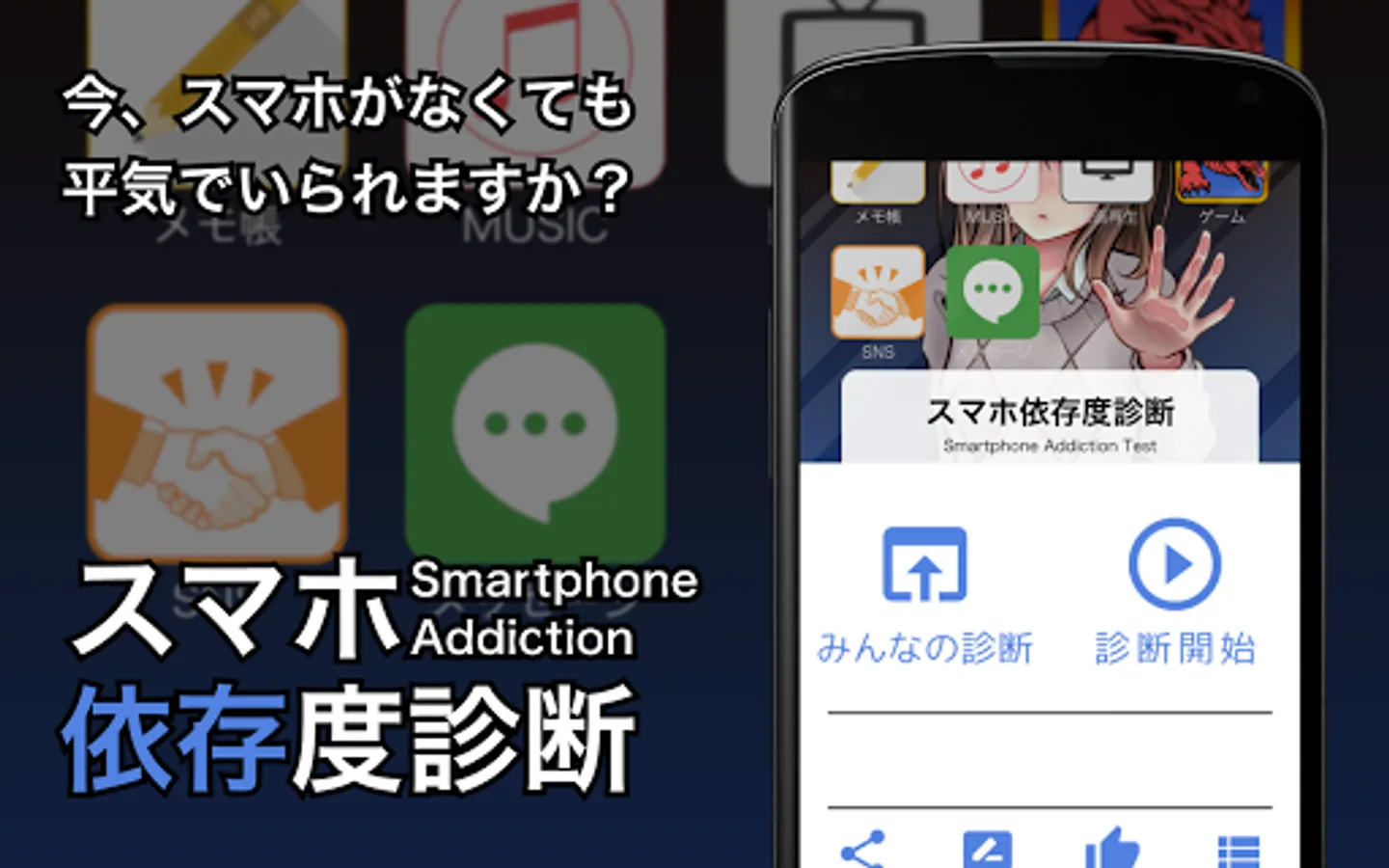 This diagnostic app diagnoses how much you depend on your smartphone just by answering 15 questions randomly asked and psychological tests ♪ ♪