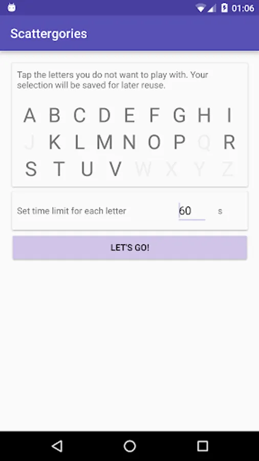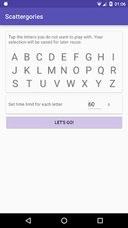 Now and then a round of Scattergories with your friends can be very pleasing. But how can you make sure the letters you are playing are unbiased? That is exactly what this app is for!