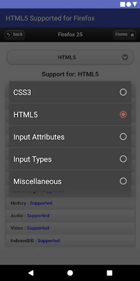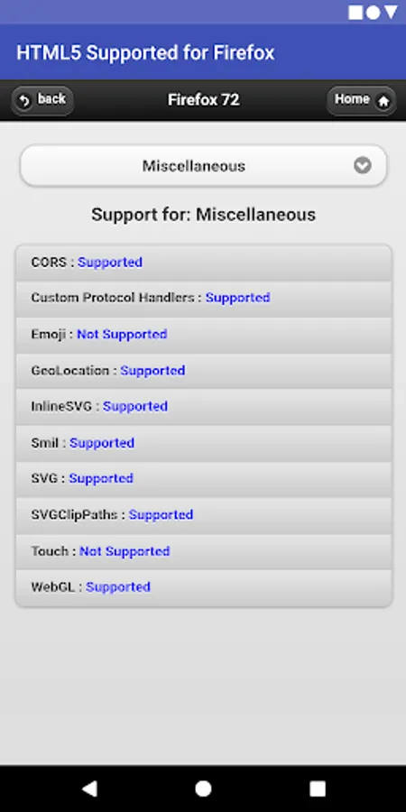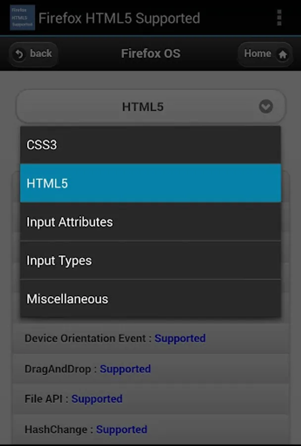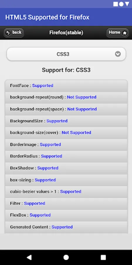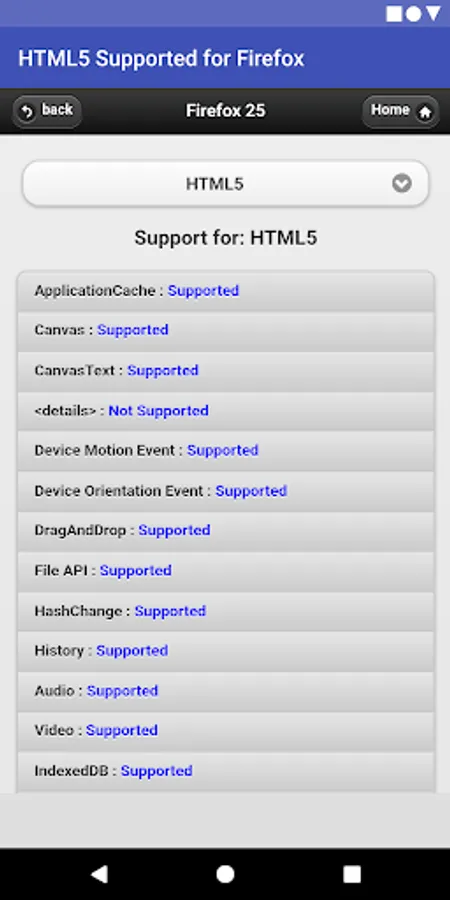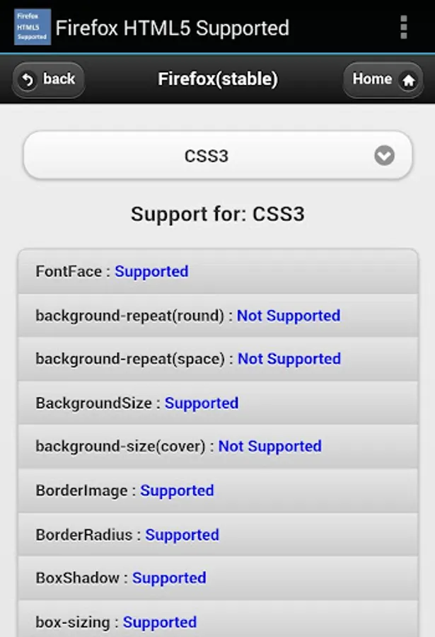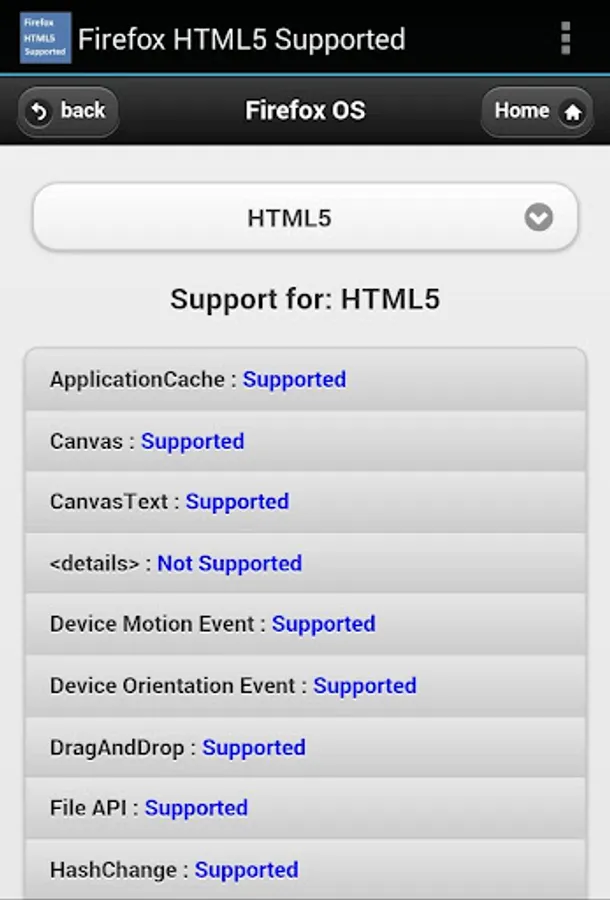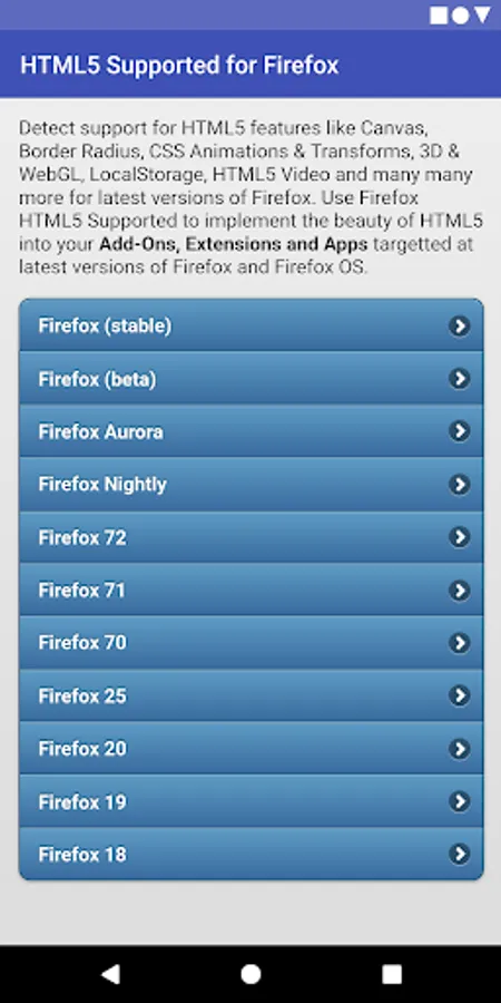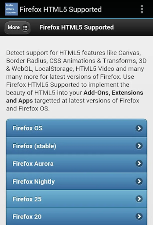 Detect support for HTML5 features like Canvas, Border Radius, CSS Animations & Transforms, 3D & WebGL, LocalStorage, HTML5 Video and many many more for latest versions of Firefox.