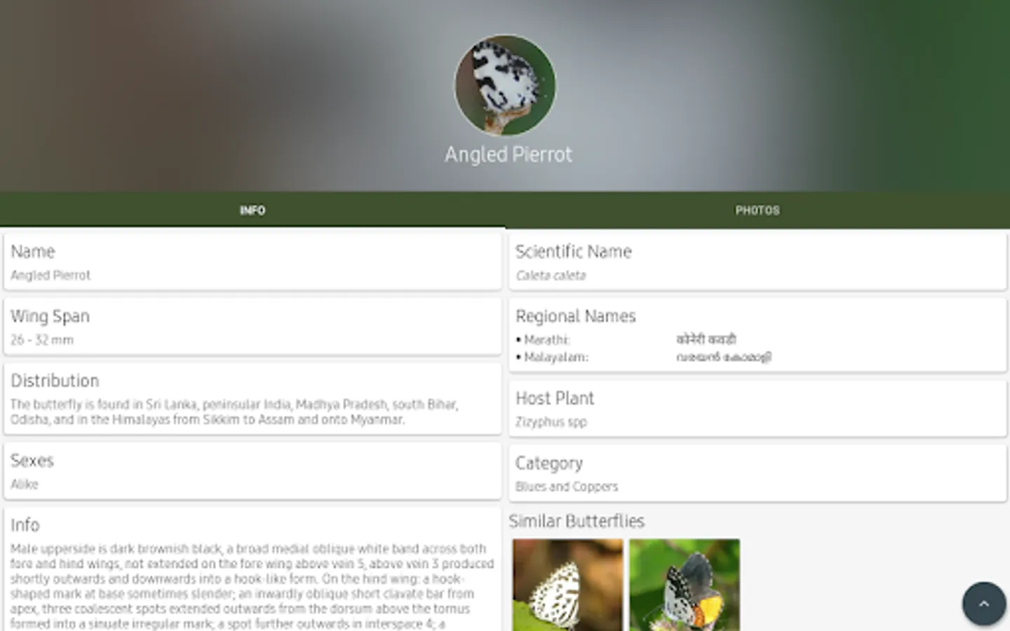 Indian Butterflies is an ultimate field guide with information like butterfly's wing span, sexual differences, habitat, host plant, interesting facts, flight period, etc. users can use it easily at fields and sites.
