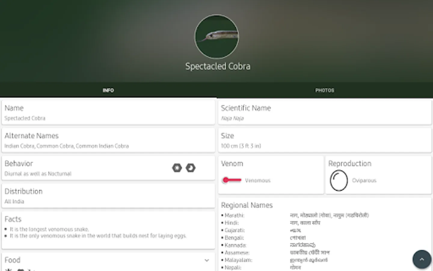 "Indian Snakes" app is the only application available on android market which displays snake names in regional languages such as Marathi [मराठी], Hindi [हिन्दी], Gujarati [ગુજરાતી], Bengali [বাংলা], Kannada [ಕನ್ನಡ], Malayalam [മലയാളം] and Tamil [தமிழ்]. "Indian Snakes" app works in offline mode and can be moved to SD Card. With great user interface, "Indian Snakes" app is very easy to use as a "field guide" as well.