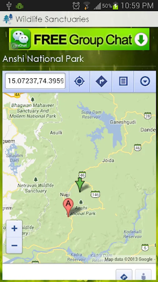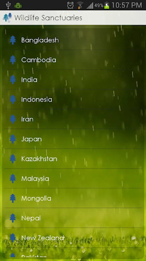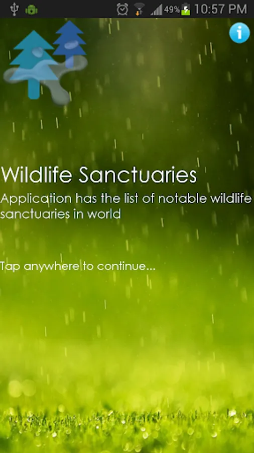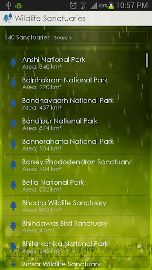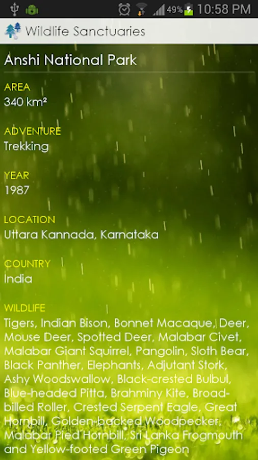 Application starts with the list of countries and then country-wise list of records of - Wildlife Sanctuaries, National Parks, State Parks, Wildlife Reserves. User can further see pieces of quick information such as: total area of the place, adventures it offer, starting year, exact location, wildlife species found. Additionally, if you have a active internet connection; it also shows the place on Google Map within the detail screen.