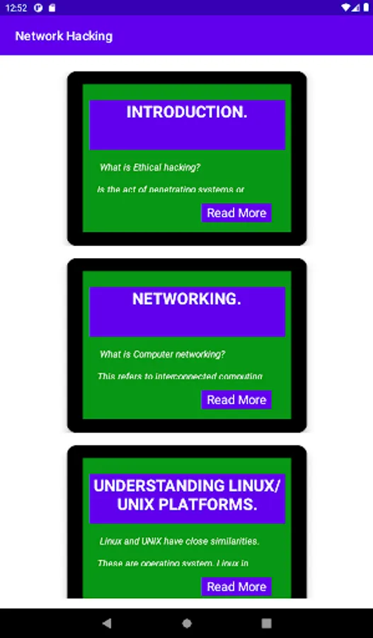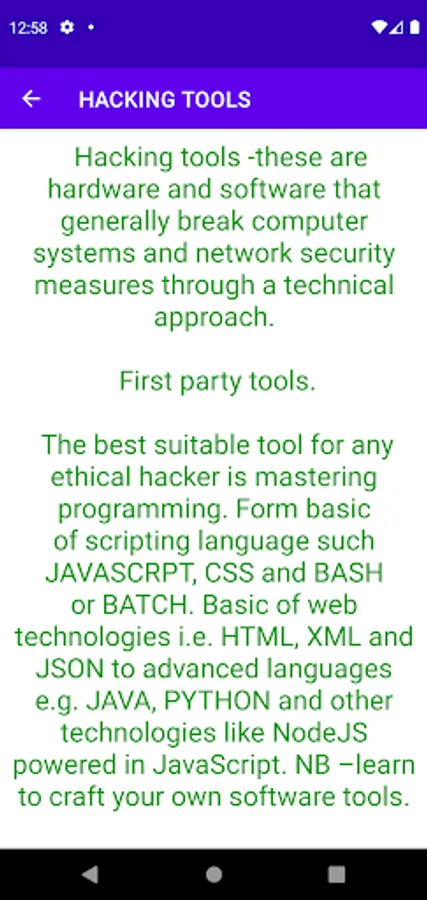 Its education based for beginners in ethical hacking, the app contains four chapters that gives learner basics.