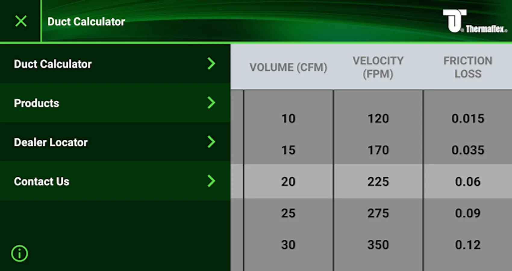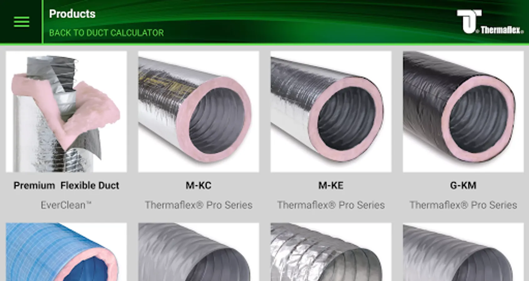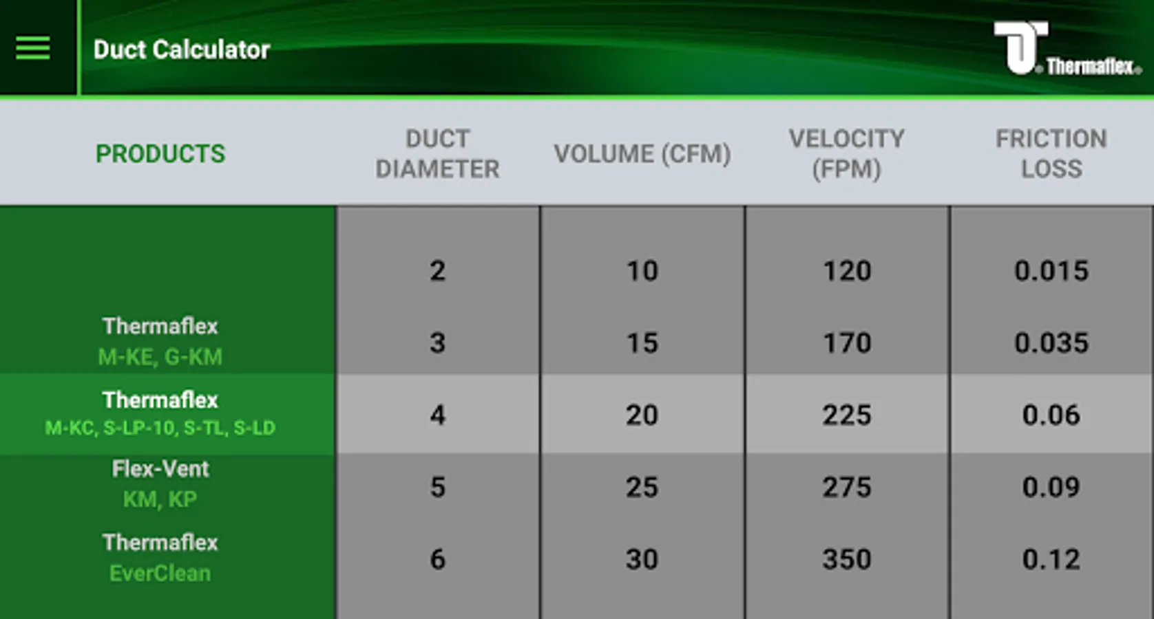 Simply select the Thermaflex product you’re installing, as well as the friction loss and volume present in the system – the app will calculate the velocity of the system and display the appropriate size Thermaflex duct for your application.