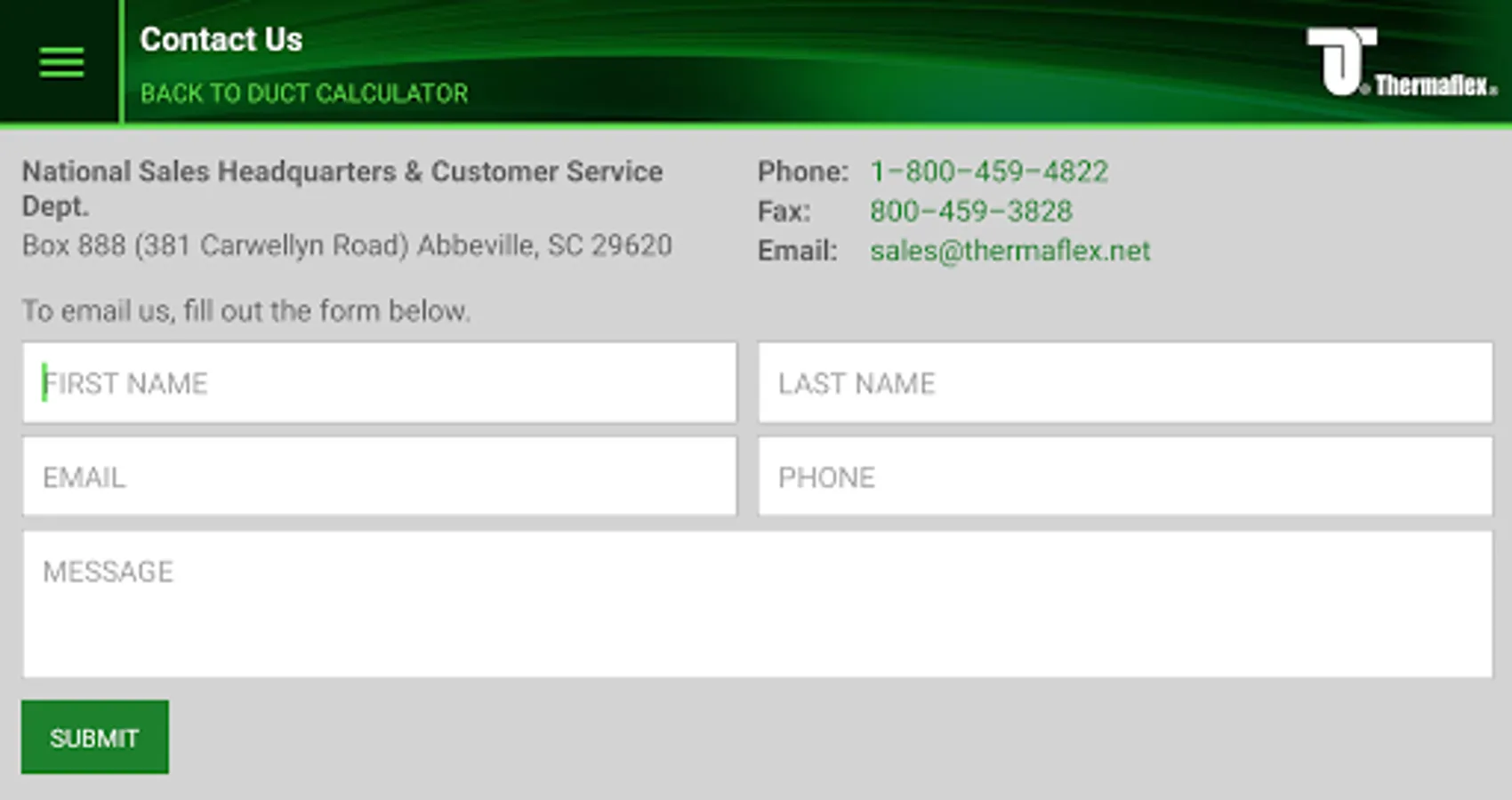 The app Contact Page submits questions and requests directly to Thermaflex team