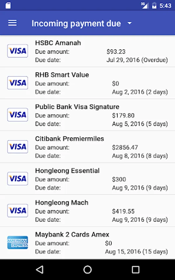 This credit card manager arranges your credit card information in a simple way and reminds you of important due dates. Optionally you can record transactions to keep track of your credit card usage.