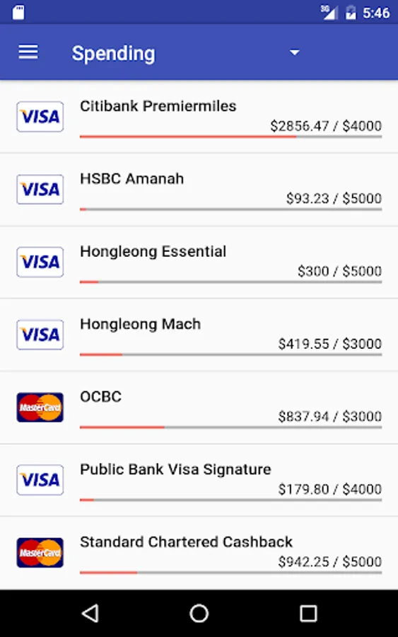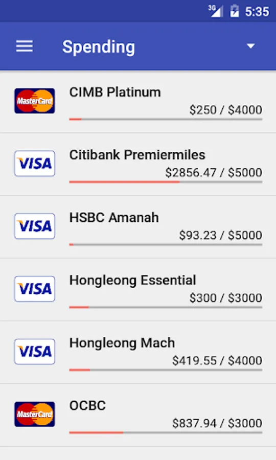 Note: As the credit card manager works totally offline, the information presented depends solely on the information provided. If you want to see how much is charged per card you'll have to manually enter and update each transactions just like any expense manager.