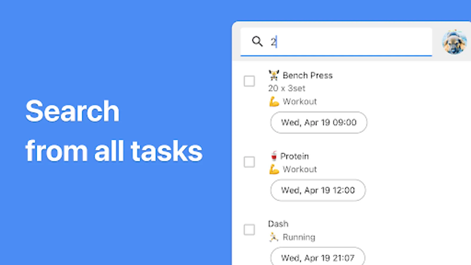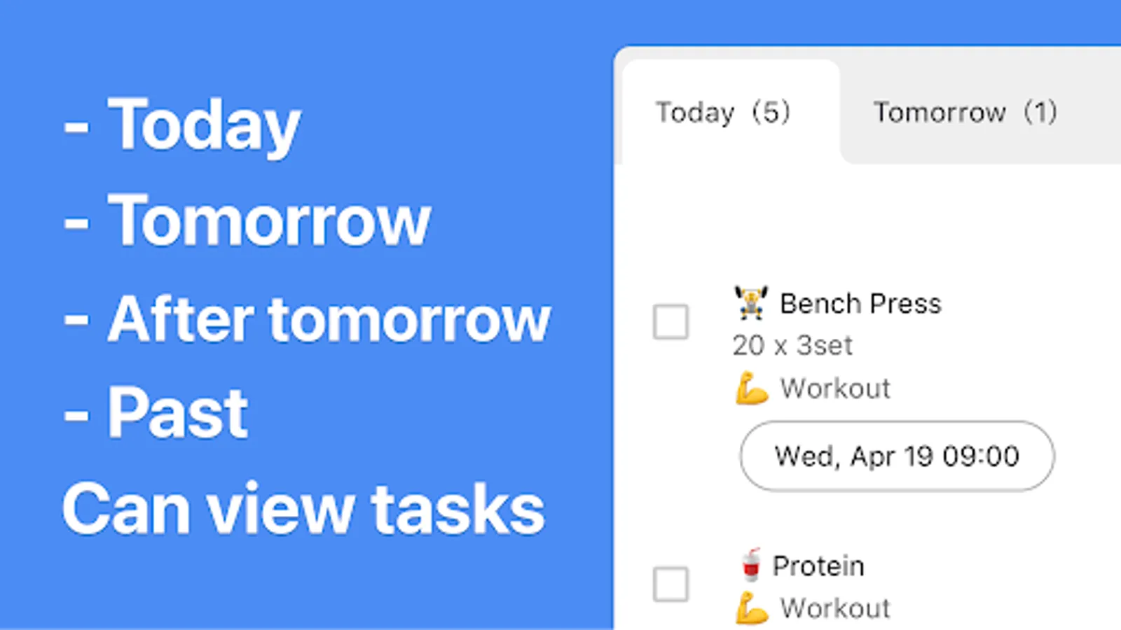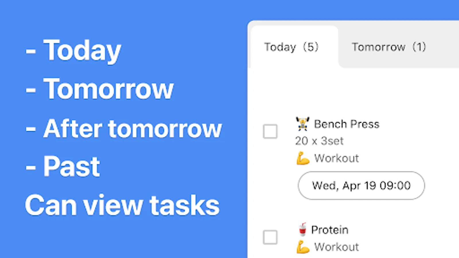 Task display of "today", "tomorrow", "the day after tomorrow", "overdue", "all", global search, alphabetical or date sorting, synchronization with desktop apps, multi-account support!