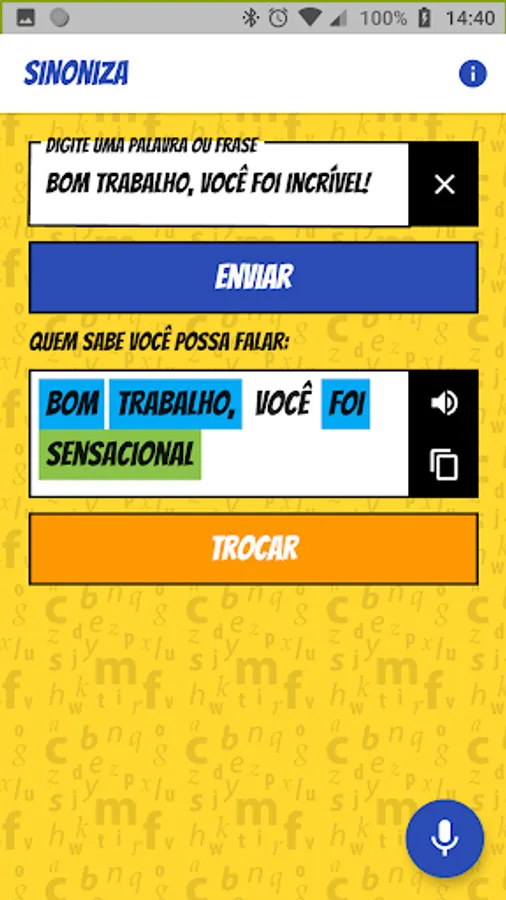 With Sinoniza you can type a word or phrase or even speak and discover synonyms of each word separately and thus form new phrases to use in your day-to-day or even in your schoolwork.