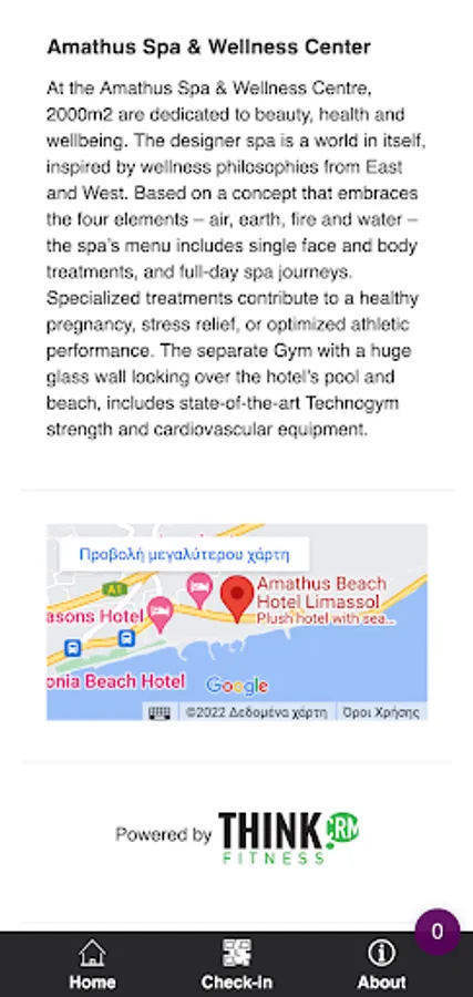 At the Amathus Spa & Wellness Centre, 2000m2 are dedicated to beauty, health and wellbeing. The designer spa is a world in itself, inspired by wellness philosophies from East and West. Based on a concept that embraces the four elements – air, earth, fire and water – the spa’s menu includes single face and body treatments, and full-day spa journeys. Specialized treatments contribute to a healthy pregnancy, stress relief, or optimized athletic performance. The separate Gym with a huge glass wall looking over the hotel’s pool and beach, includes state-of-the-art Technogym strength and cardiovascular equipment.