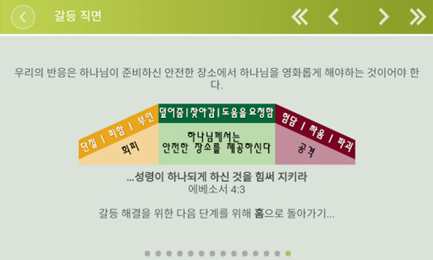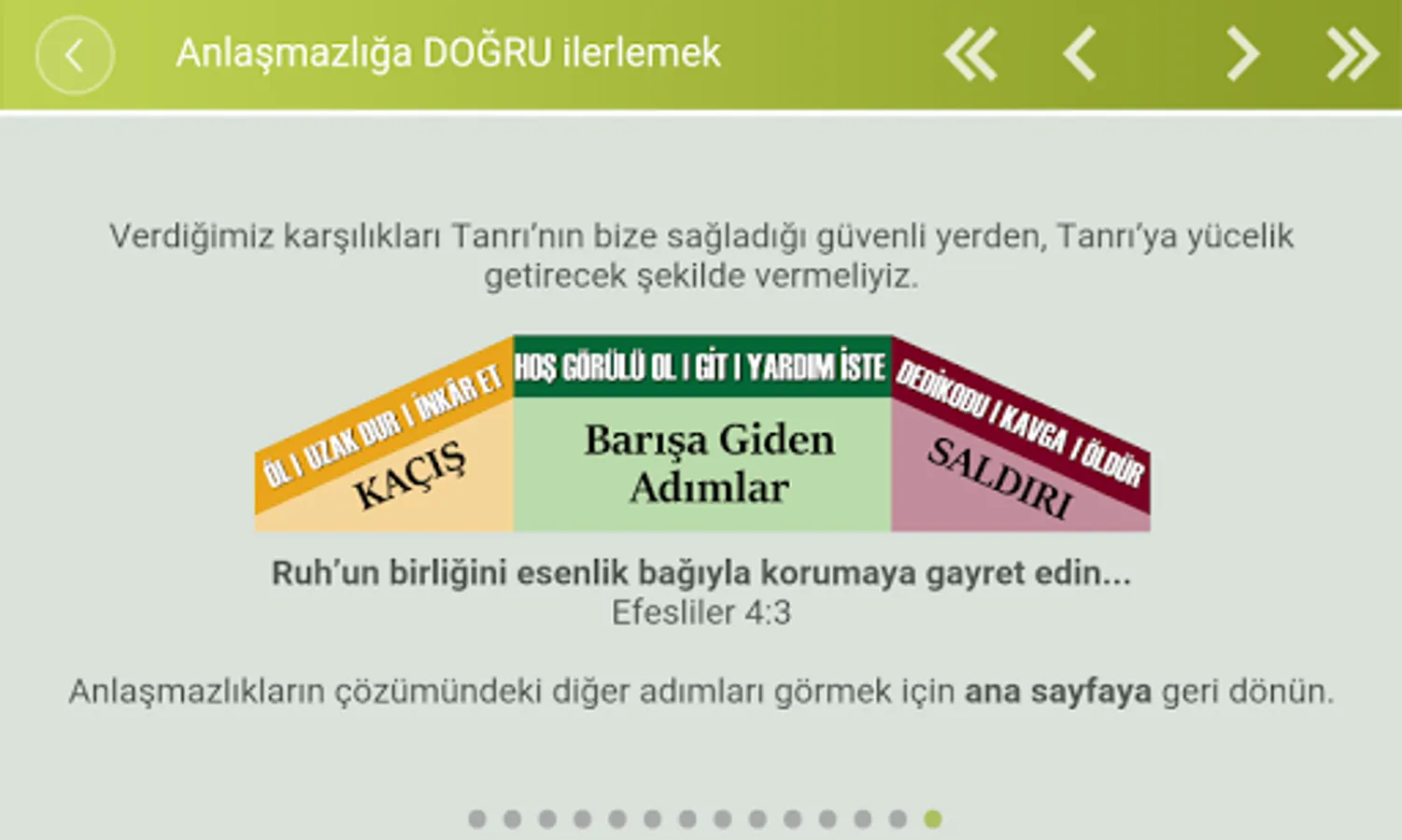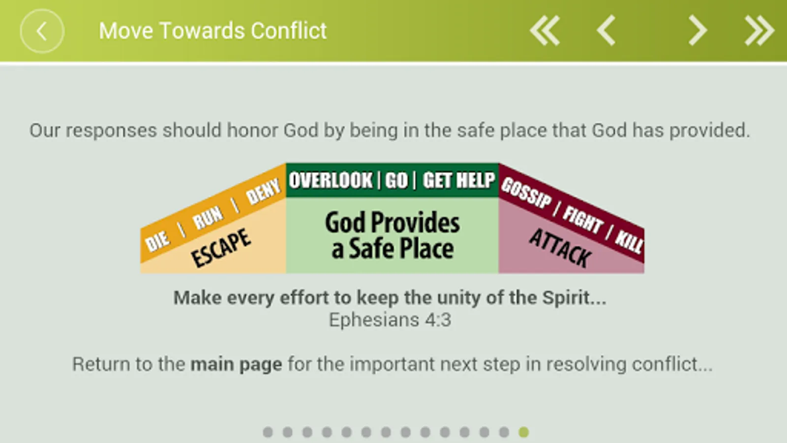 Organisational peacemaking is based upon personal reflection where we repent from our sins, forgive our brother, and, when possible, overlook their offense. When it is not possible, conflict resolution moves to the interpersonal level which involves the restoration of the relationship or constructive separation. If this is not successful, leadership becomes involved in the process. If successful resolution of the conflict is still not reached, members involved in the conflict should submit to a final decision made through arbitration.