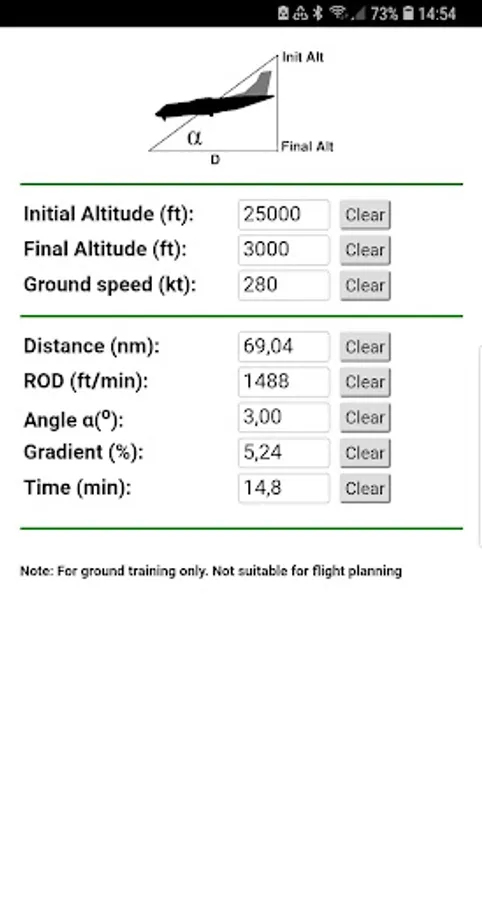 Determines the descent profile of an aircraft: for a given descent height calculates angle and gradient of descent, distance and rate-of-descent. The descent height is defined by an initial altitude (Top-of-descent - TOD) and a final altitude.