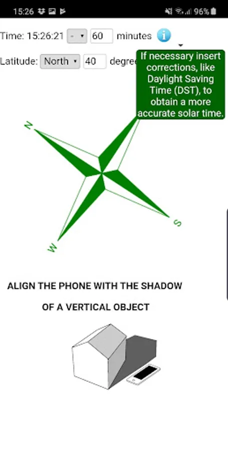 The accuracy of the indication can be improved by correcting the solar time if necessary, as for example if Daylight Saving Time (DST) is in effect. The user must also indicate the location in terms of the current hemisphere; North or South. To further improve the indications an estimate of the latitude of the current position can also be indicated.