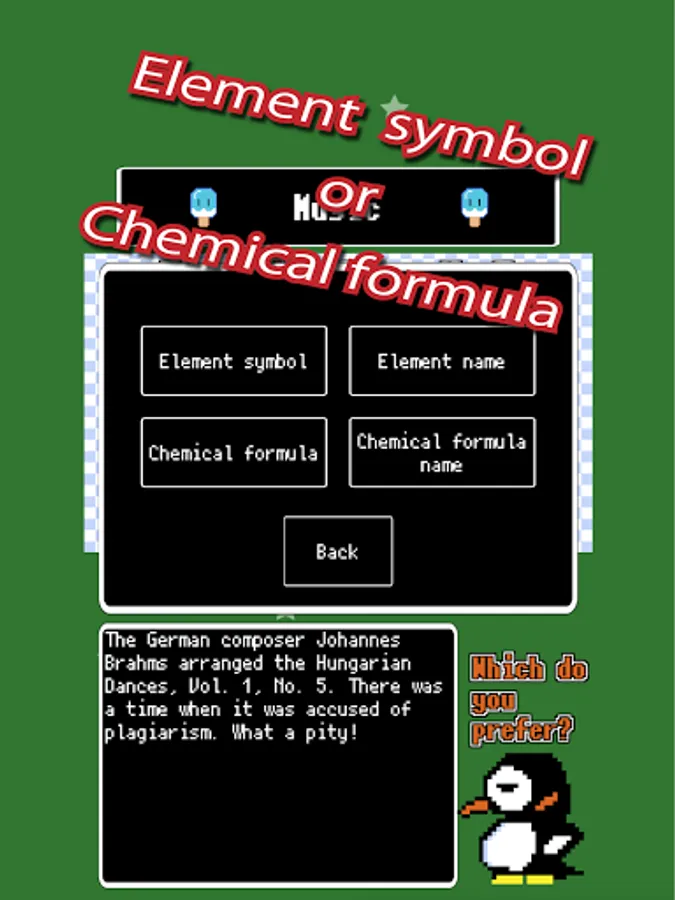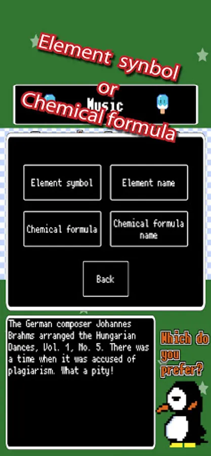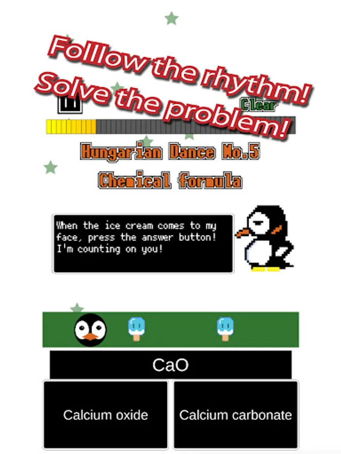 "Chemical Rhythm" is a game that allows you to memorize elemental symbols and chemical formulas while enjoying the game by solving the questions one after another to the rhythm of classical music.