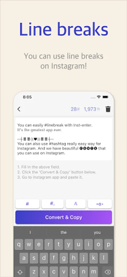 Decorate your posts using your own popping fonts and emoticons, and easily manage hashtags.