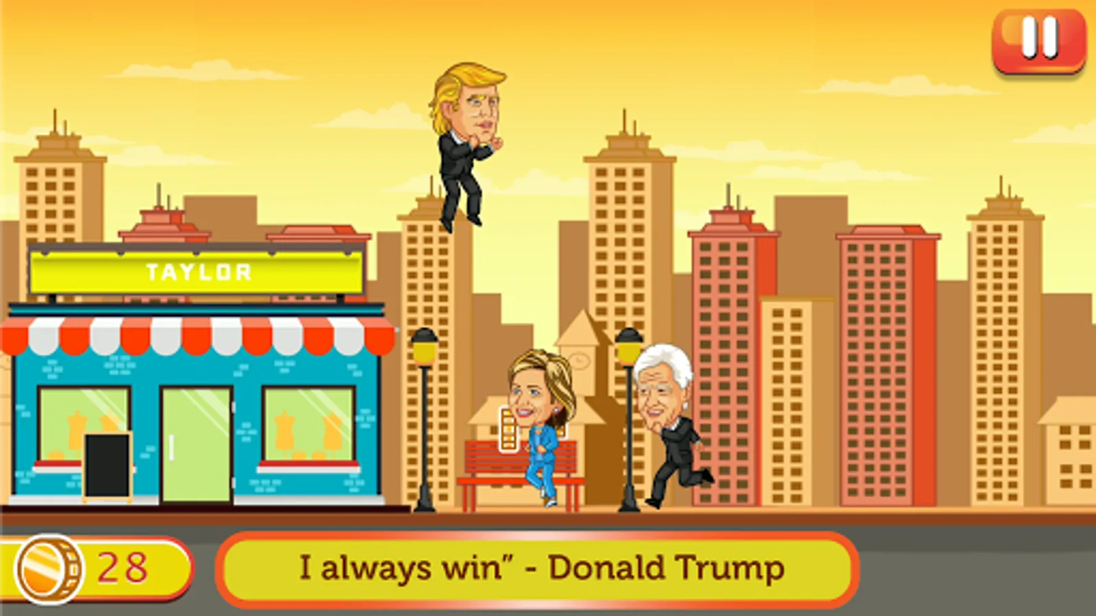 This Donald Trump jump game is not a simple one. No matter that the controls are smooth and easy, the game still is challenging. You will discover Barack Obama, Hillary Clinton, Bill Clinton, along with President Trump. They will create so much trouble for the President. Don't get hit by them, whenever they approach, just tap and tap to jump over them.