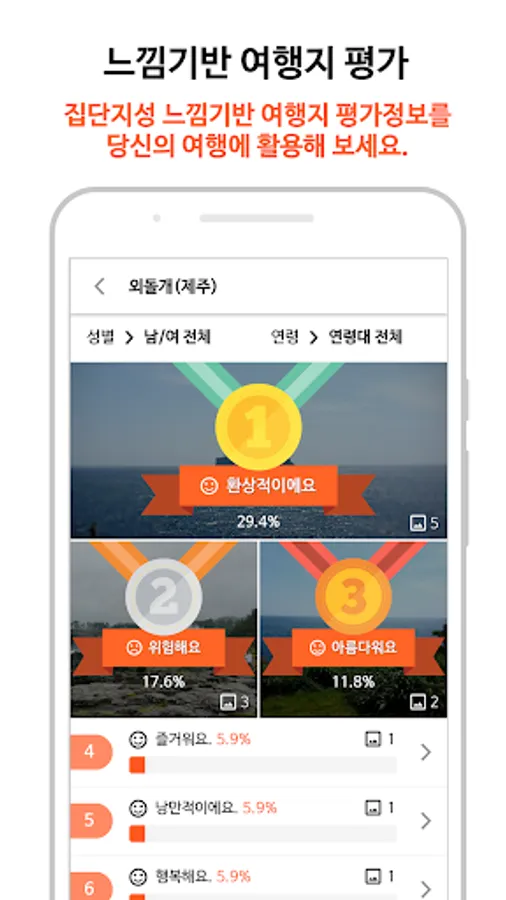 It accumulates feelings shared by travelers and provides collective intelligence feeling-based travel destination evaluation information calculated by Travelshot's unique travel destination evaluation algorithm.