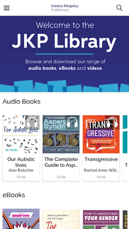 For the first time, you can download and stream our rich library of video content – only available through this app – as well as listen to our audiobooks and download our bestselling eBooks in autism, education, mental health, social work, gender diversity, dementia and adoption and fostering.
