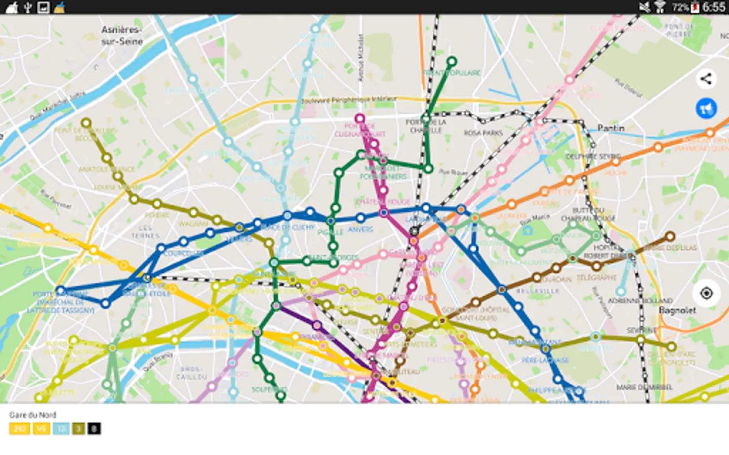 1) On the screen of your device you will see the whole Paris's public transport scheme, and the more scale is choosen the more details are given.