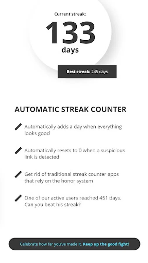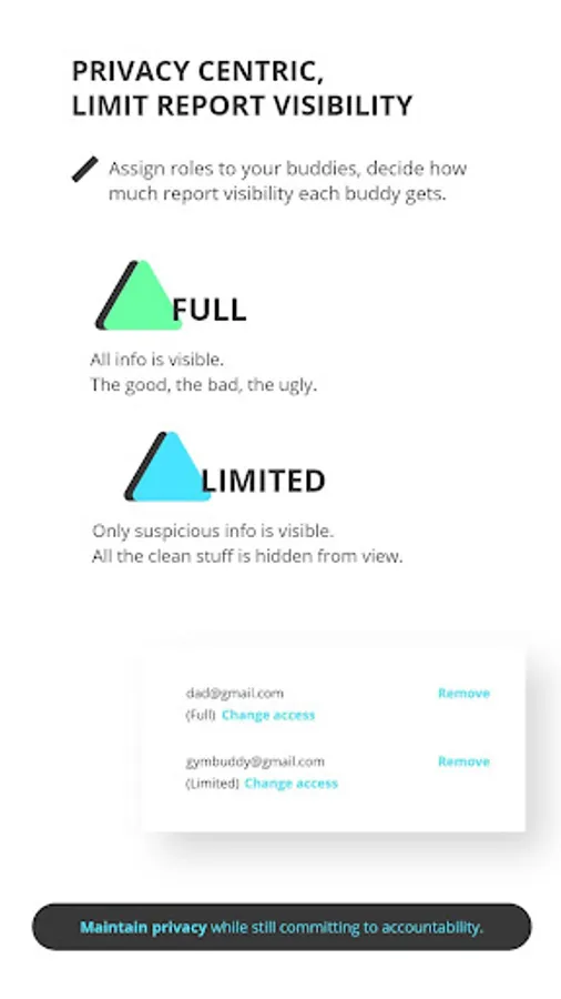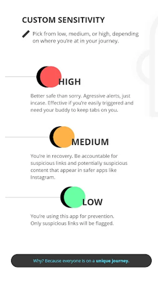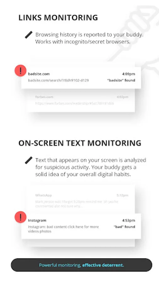 *This app uses Accessibility services. It uses the BIND_ACCESSIBILITY_SERVICE permission to monitor text and links. This is a powerful feature that helps people stay accountable on their devices.