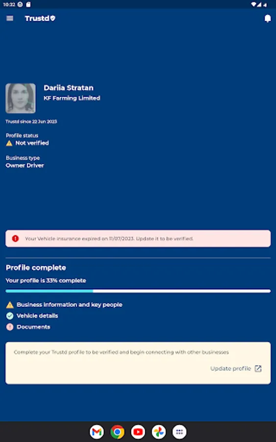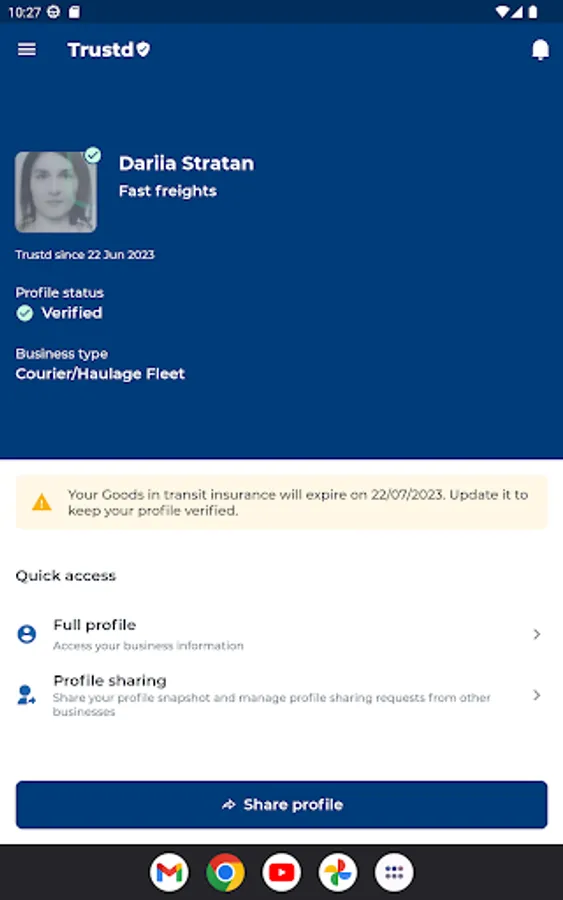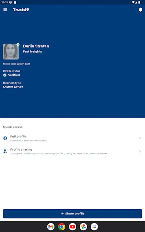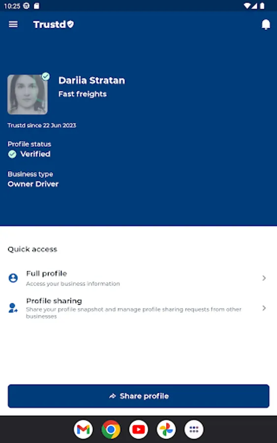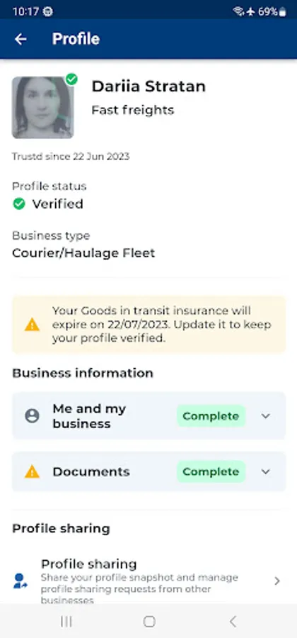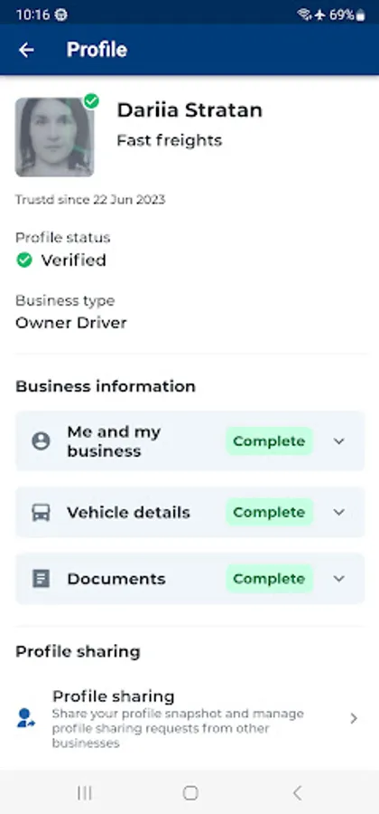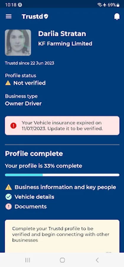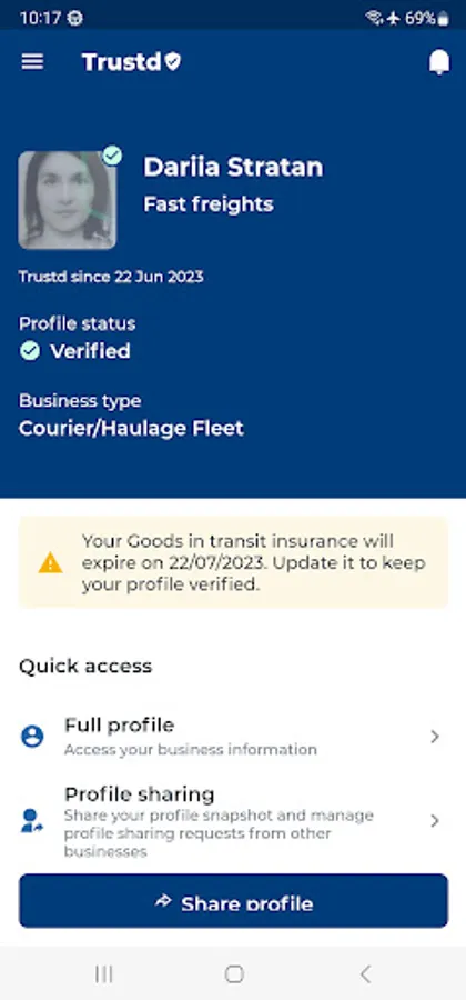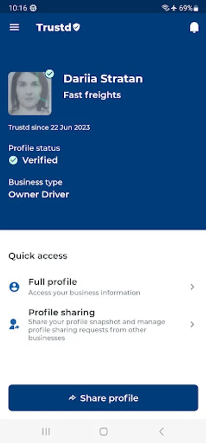 Trustd is revolutionising transport & logistics by giving control back to the carriers. Take control of your business and your data with Trustd – your digital business identity and professional passport. Create your Trustd profile and become ‘Verified by Trustd’ - showcase your credentials and elevate your business above the competition.