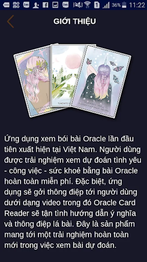 Oracle fortune telling application appeared for the first time in Vietnam. Users can experience predicting love - work - health with Oracle completely free. In particular, the application will send messages to users in the form of video in which Oracle Card Reader will enthusiastically guide the meaning and message of the card. This is a product that brings a whole new experience in watching predictions.