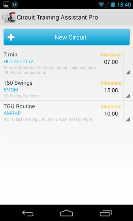 For variety, the app includes several circuit formats: Interval Training (HIIT, Tabata), Every minute on the minute (EMOM), For time and As many rounds as possible in a give time frame. The workouts are based on a predefined set of video illustrated bodyweight exercises or kettlebell exercises.