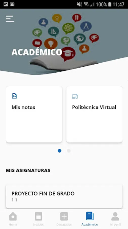 • Private profile: all your personalized data according to your university profile. Check your subjects, grades, etc. And also your digital university card. You will always carry it with you!