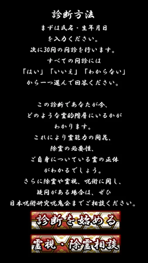 It is a simple diagnostic application for those worried about spiritual disorder and spirit under the supervision of the professional institution of curse and magic, the Japanese magical research cursed party. We recommend that you consult experts for details, but I would appreciate it if you could use it as a simple reference before consultation. Consultation about the curse is accepted for 24 hours.