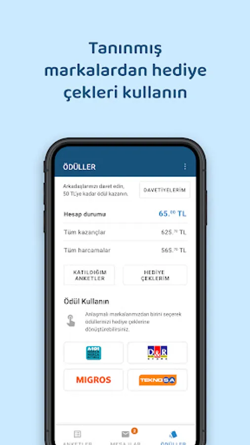 You can spend your earned rewards by turning them into gift certificates valid for various well-known brands of our country such as A101, D&R, Migros, Teknosa.