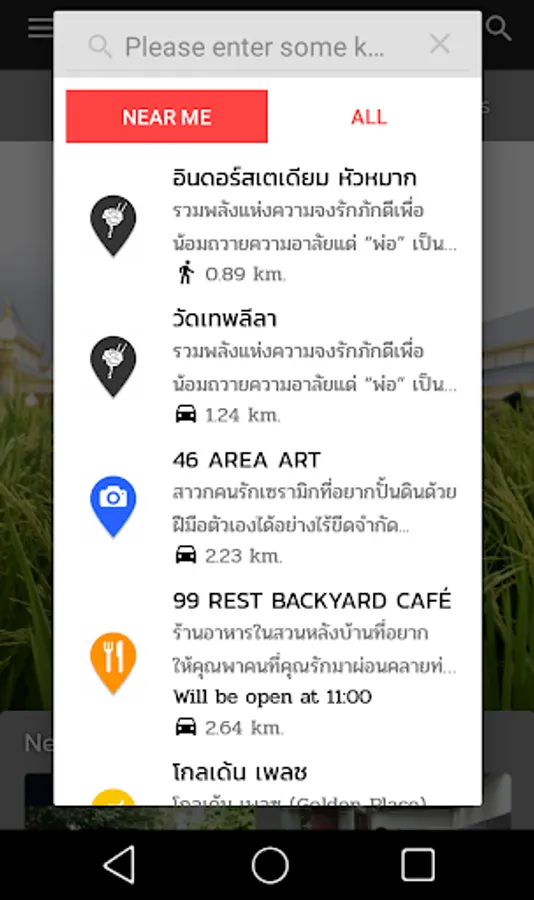 [ค้นหา] – พิมพ์สิ่งที่อยากค้นหา จะแสดงจุดแนะนำเรียงตามระยะทางใกล้ไกล