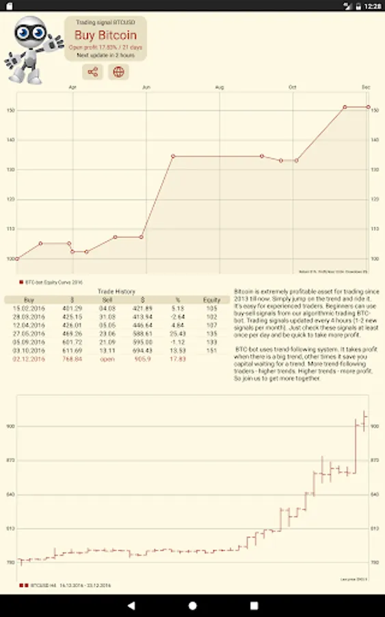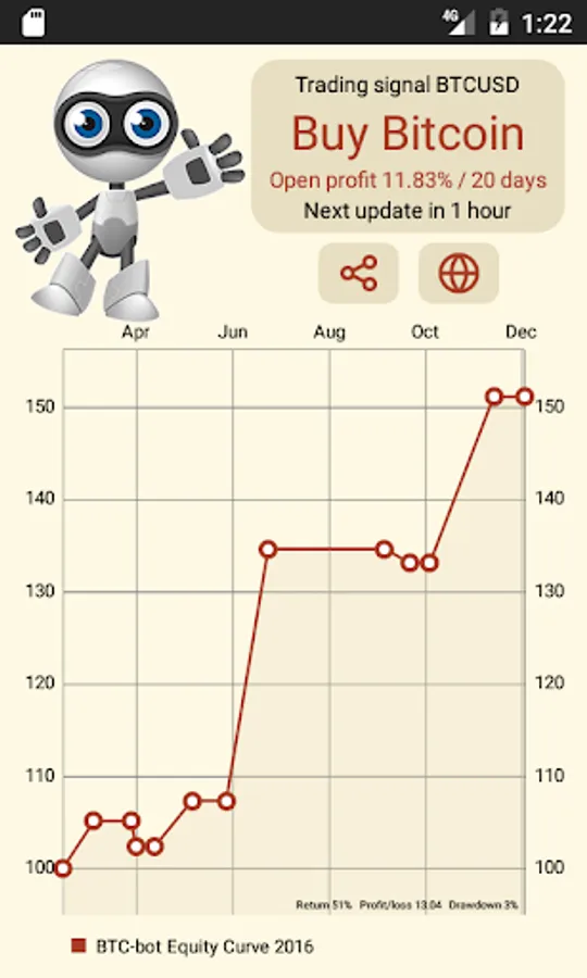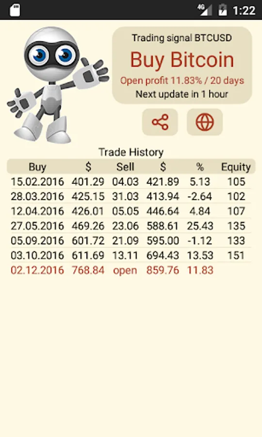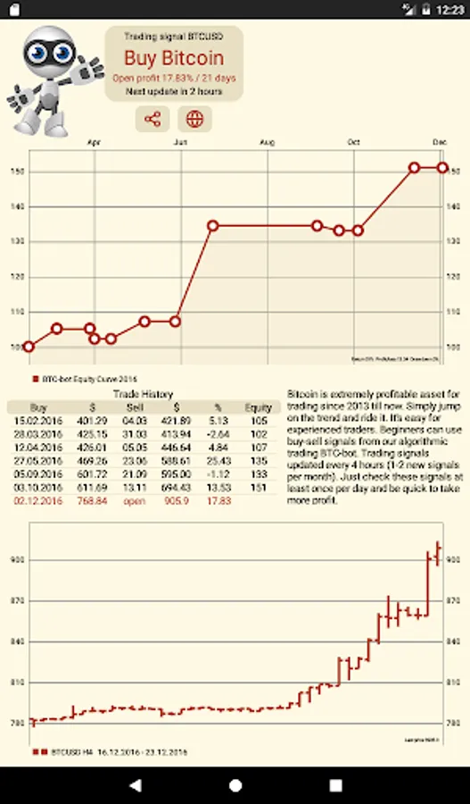 Bitcoin is high-profitable and easy to trade last years. But when to buy and when to sell bitcoins? BTC trading bot solves this problem and generates 20-300% profit per year. Check "buy-sell" signals at least once per day and be quick to take more profit.
