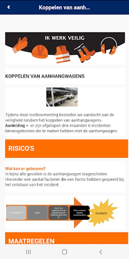 In addition, the app is used to perform workplace inspections and to hold and record meetings such as toolbox meetings. Information such as Toolboxes and Learning from incidents can also be found in the app and news messages are sent.