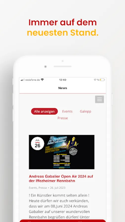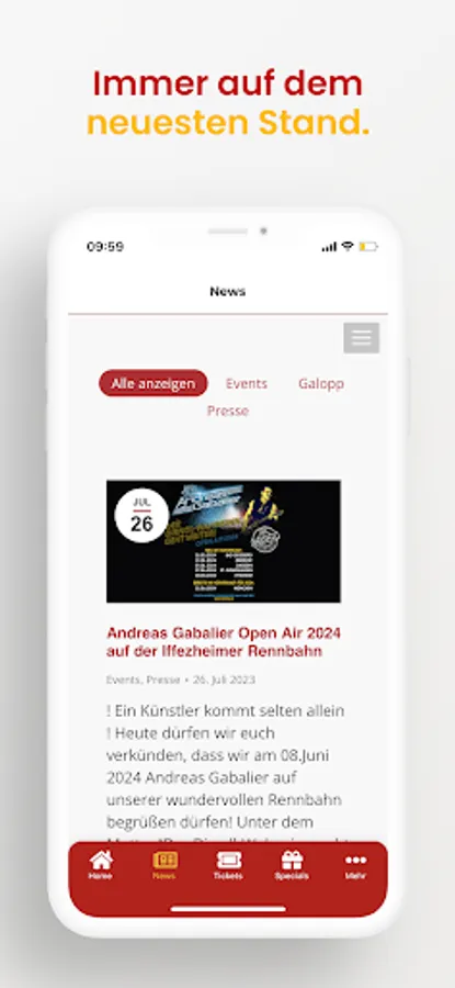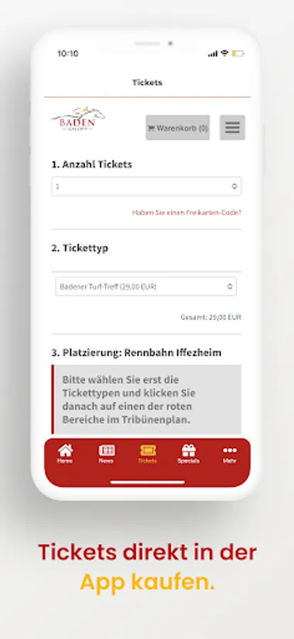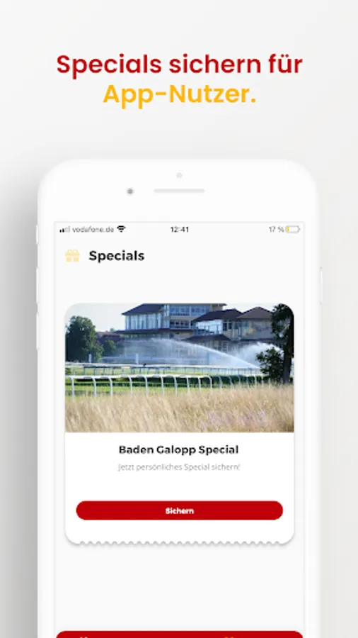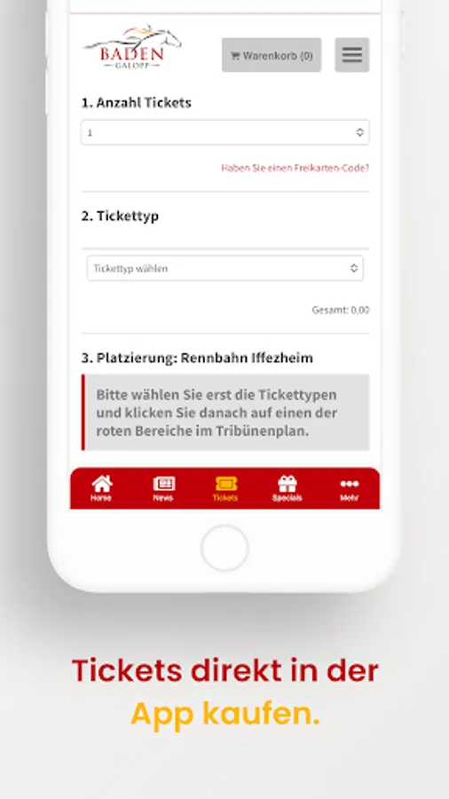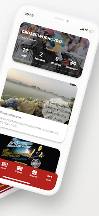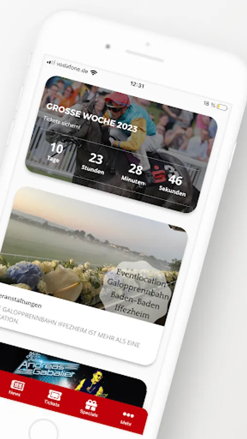 The Baden Galopp App is your digital companion through the racing days on Germany's most beautiful and most important racecourse. It offers numerous opportunities to round off your visit to the racetrack. You can use it to book tickets and call up all the important information such as starter lists, quotas and forms. You will also find everything about the supporting program of the race days, the gastronomy and the children's area. Numerous special offers and discounts are waiting exclusively for you as an app user. With the Baden Galopp app, the digital world opens up for the racecourse visitors and thus ensures incomparable moments.