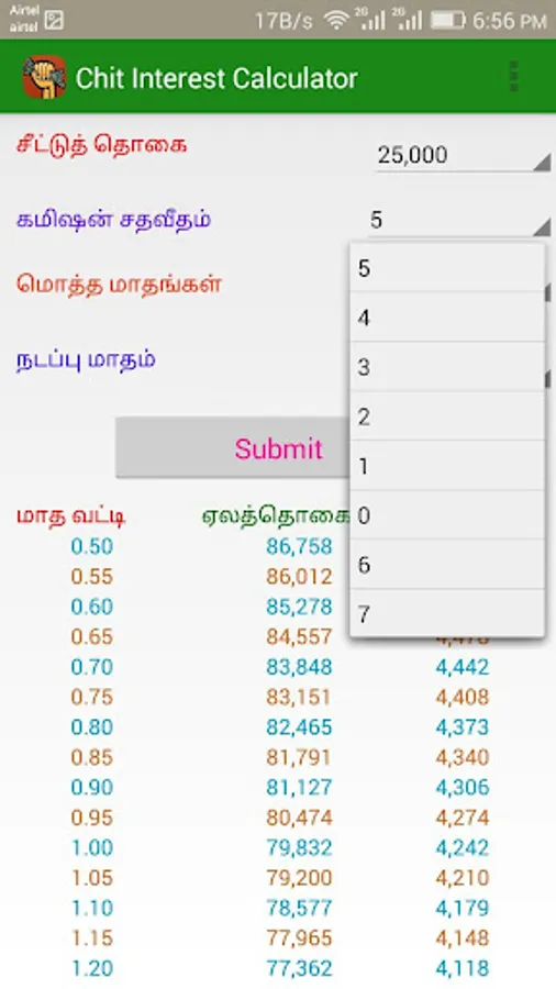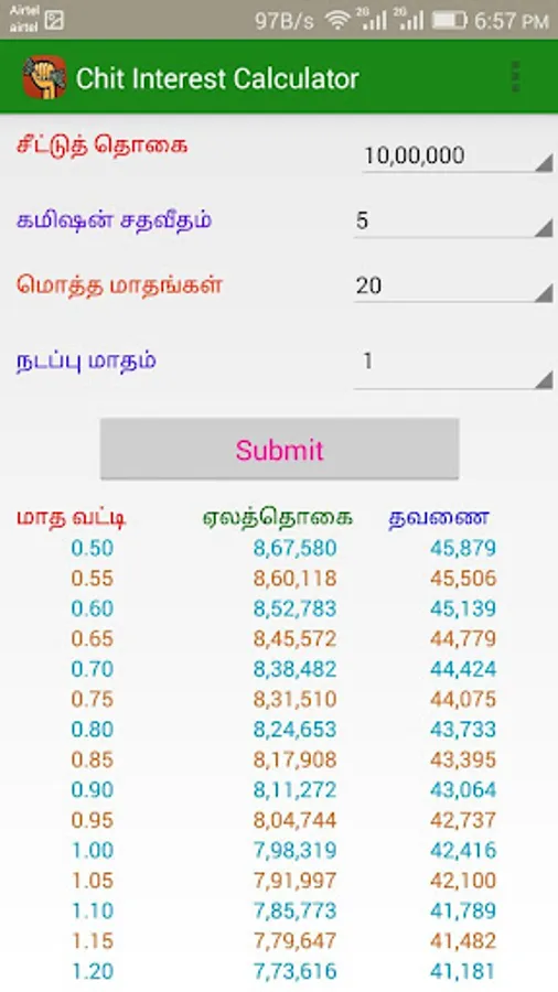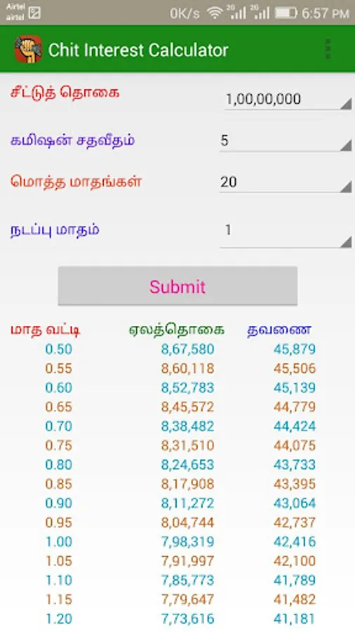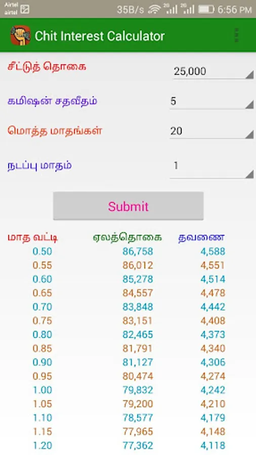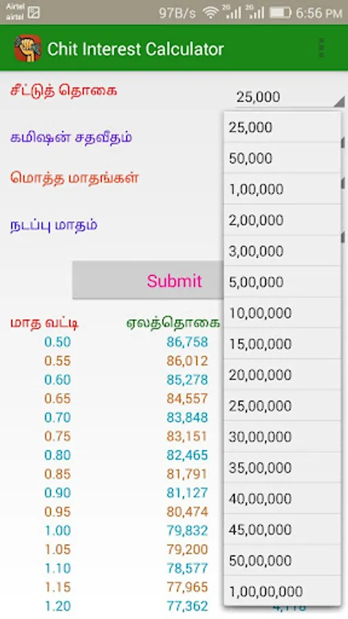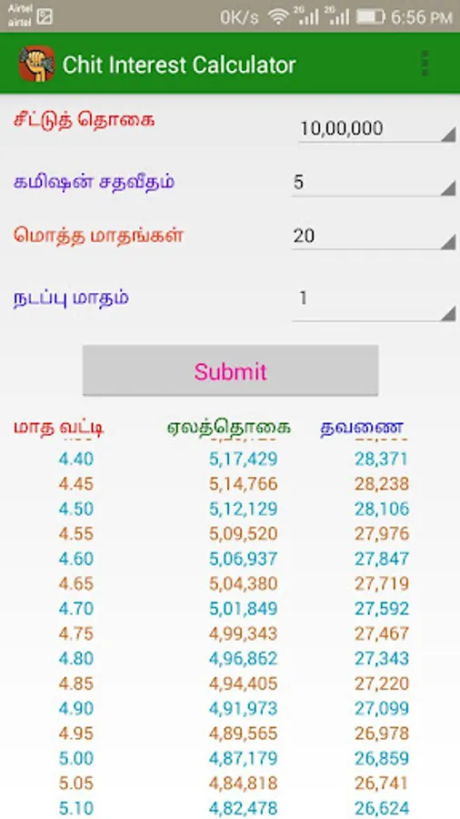 25,000 சீட்டு முதல் 1 கோடி ரூபாய் சீட்டு வரை எந்த மாதம், என்ன வட்டி விகிதம், எவ்வளவு ஏலத்தொகை என்பதை மிக எளிதாக சில நொடிகளில் கணக்கிட்டு தெரிந்து கொள்ள உதவும் ஒரு மென்பொருள்.